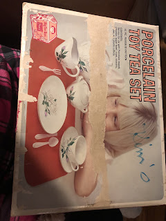 My father recently sold one of his houses, and among the treasures I received was my childhood porcelain tea set. My mother had taken the time before she left this world to carefully label it “Kim’s” with a blue magic marker. Since I’m the only daughter, that probably wasn’t necessary, but it shows she wanted to make sure I got it when the time came. Our dad has lost his moorings and is now dating a woman with three grown children and 11 grandchildren and who doesn’t like dogs, so perhaps mom‘s labeling was more intuitive than any of us would have believed. In any case, it’s a Hygge feeling to get my tea set back on the other side of 50. I look at the disintegrating box and think of how we’ve both aged, this tea set and I. We both have been broken along the way and are missing a few pieces from our original start up set, but we can still hold water.
