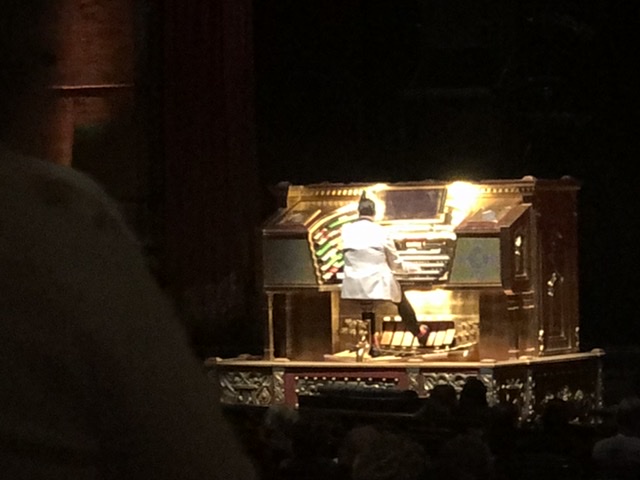 On Saturday, my good friend Adrienne called to see if I wanted to go see the all-new Tootsie at Atlanta’s Fabulous Fox Theater, where the top hatted and gloved, 1920’s-tuxedo-uniformed greeter still rings a bell, holds up his arms, and in his most theatrical voice (drawing out the words), belts out to the throngs awaiting the opening of the doors in the covered black-and-white tiled hallway-breezeway with the red carpet leading inside: “Laaaaaaaaaaadieeeeeees aaaaaaaaaannnnndddd Gentlemennnnnnnn! Welllllllcommmmmmme to the Faaaaaaaaaaabulous Fox Theeeeeeater!” before stepping aside to the almost as theatrical door opening. Regardless of what’s playing at The Fox, I’ll always go – not just for the show, but for the whole cultural arts experience, including the Mighty Mo and the Arabian Nights atmosphere, with its blue night-skylit ceiling complete with stars and ornate decor – and the exquisite restrooms! The place has quite a history with many saviors to thank for its continued breath and haunting ghosts, and it has inspired my Haiku of Whimsy today, prompted by the blog at http://www.sharingourstoriesmagic.com. The Mighty Mo emerges from the floor , with the organ player already piping out beloved tunes – usually in a sequined white jacket draping over the back of the organ bench as he plays to entertain while ticket holders arrive. The crescendos strain more fully in his last number, bringing wild applause as the Mighty Mo and its player descend back into the depths of the orchestra section….until next time. If you happen to be in Atlanta, go see Mighty Mo! You’ll be glad you did.