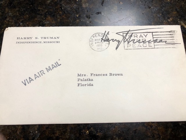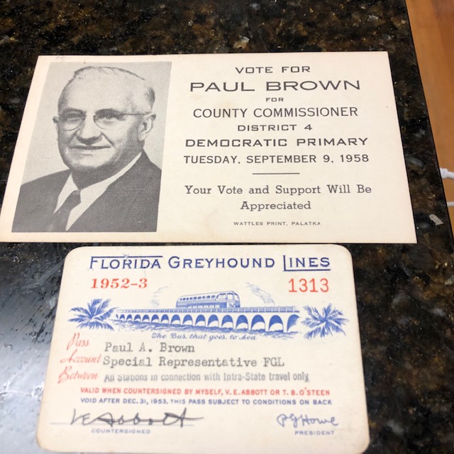 The ephemera materials I procured in the estate sale reveal Paul’s extensive involvement in numerous civic and State organizations. Over 100 membership cards surfaced in the estate materials. Certificates of honor and newspaper articles speak of men with powerful and positive influence. Interestingly, Greyhound bus passes indicated he could catch the bus anytime for easy travel in the forties and fifties. Also, the first credit card ever issued by Standard Oil Co. (in paper) was among the items in the estate collection. Paul also picked his successor as chairman of the Florida Democratic party. An index card speech for nomination of his successor is also present within the collection. The six letters of Truman (all signed) sent to Paul at various times hold interesting historical information. One of the letters has a line to Paul from Truman saying, “it is getting very dark in the war situation.” We know the rest of that story.