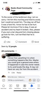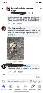 My aunt who couldn’t quit asking for a dog wouldn’t be allowed to have her, and no owner was responding to my posts about a found dog – so the dog continued to sleep on our front porch. When I left for work on Friday morning, she was nowhere to be seen, so I figured she had moved on. As I prepared for a 9:30 meeting that was running late, I checked in to see if there was any news of the dog turning up at another house. A post from our road community page caught my eye.