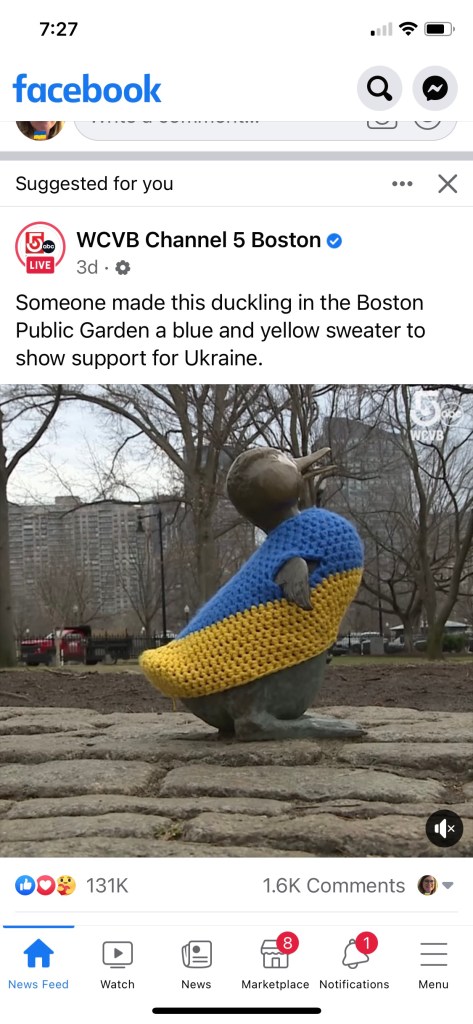 We’d walked the Freedom Trail and stopped by the Boston Public Garden to see the Make Way for Ducklings statues based on the book by Robert McCloskey. I’ve seen on the news this week that someone knitted a yellow and blue sweater and placed it on a duckling to show support for Ukraine, but for me it carries more than a show of support for Ukraine – that sweater on a duckling is a sobering reminder that there are children involved in this crisis. Children through the years have lined up to climb on the backs of the ducklings one by one, Leapfrog-style, until they get to the to the mother duck at the front; then, they run back and get in line to leap to the front all over again.