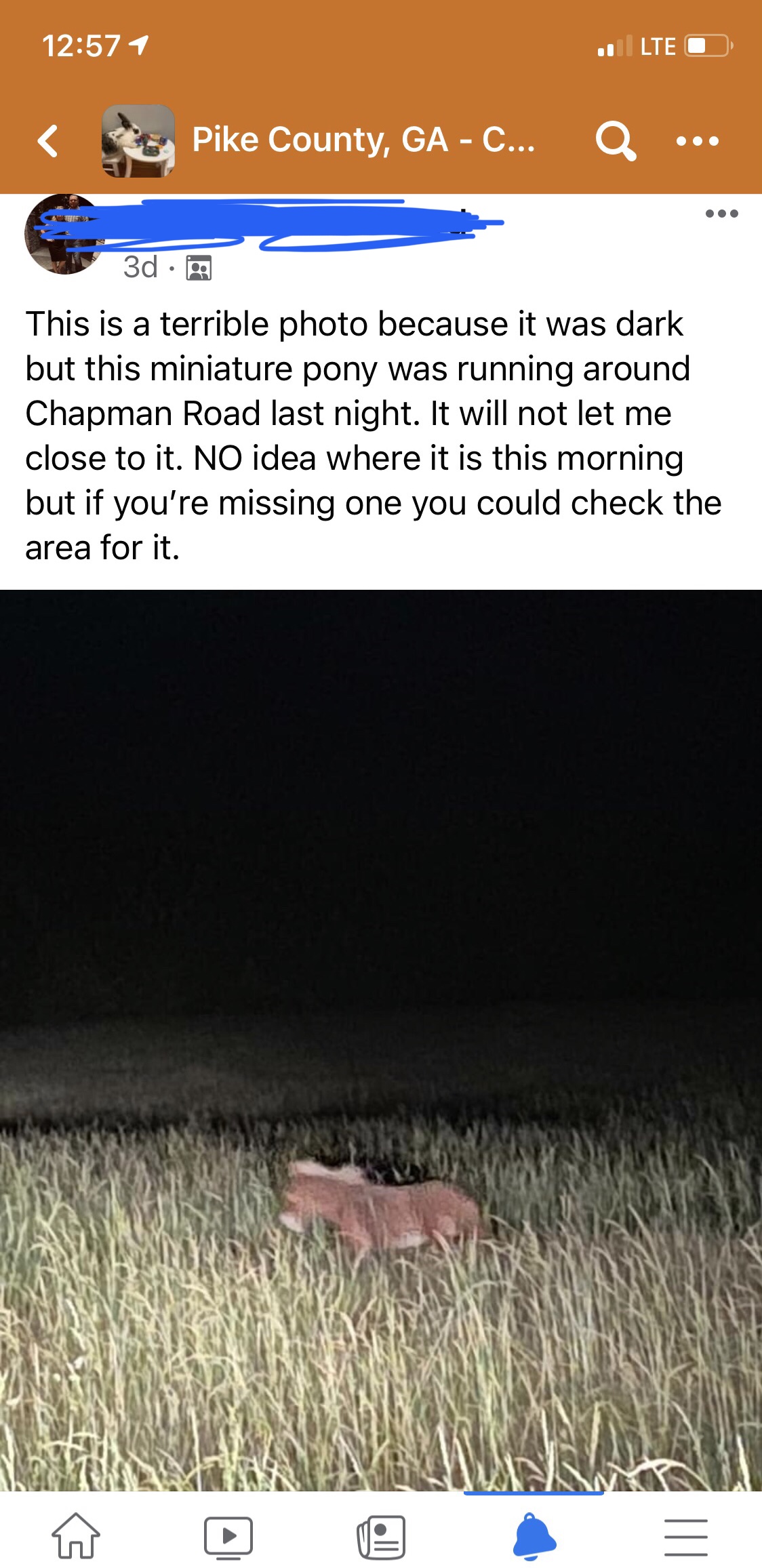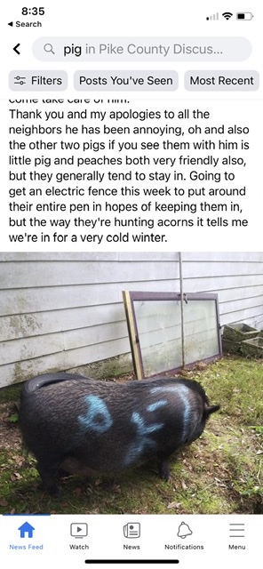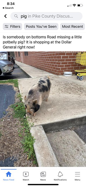 Still today, on our community discussion page, “Someone’s bull is loose over on Pedenville Road, so if you know the owner you might wanna let ‘em know.” “A miniature pony is running around over on Chapman Road, and he won’t let me close to it. No idea where it is this morning, but if you’re missing one you could check the area for it.” “A pig is running down Shady Lane, and I almost hit it. If this pig is yours, come get it before it gets hit.”
