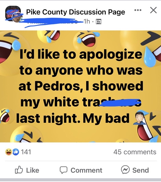 Maybe my favorite was the day I was scanning Facebook for a moment right before a serious meeting and came across this post: I’d like to apologize to anyone who was at Pedro’s. I showed my white tr@$h a$$ last night. My bad.