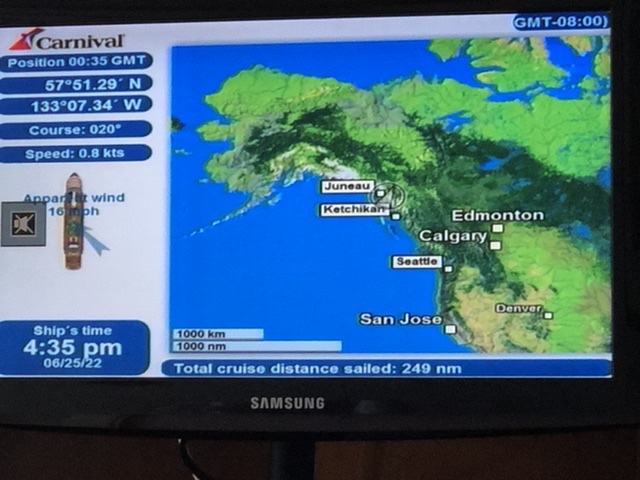 We’re scheduled to take a tour of Victoria this evening on our last night aboard the Carnival Spirit. The last night of a cruise is almost always one of dread as we anticipate debarkation and have only the memories and the transitioning sea legs to take with us from such a fun week of overindulgence in fun and food. We’re hoping to get off the boat briefly, but we aren’t booking an excursion because of stricter Canadian protocols and the threat of rain (only the first we will have seen except a heavy mist at the Seattle airport upon arrival).
