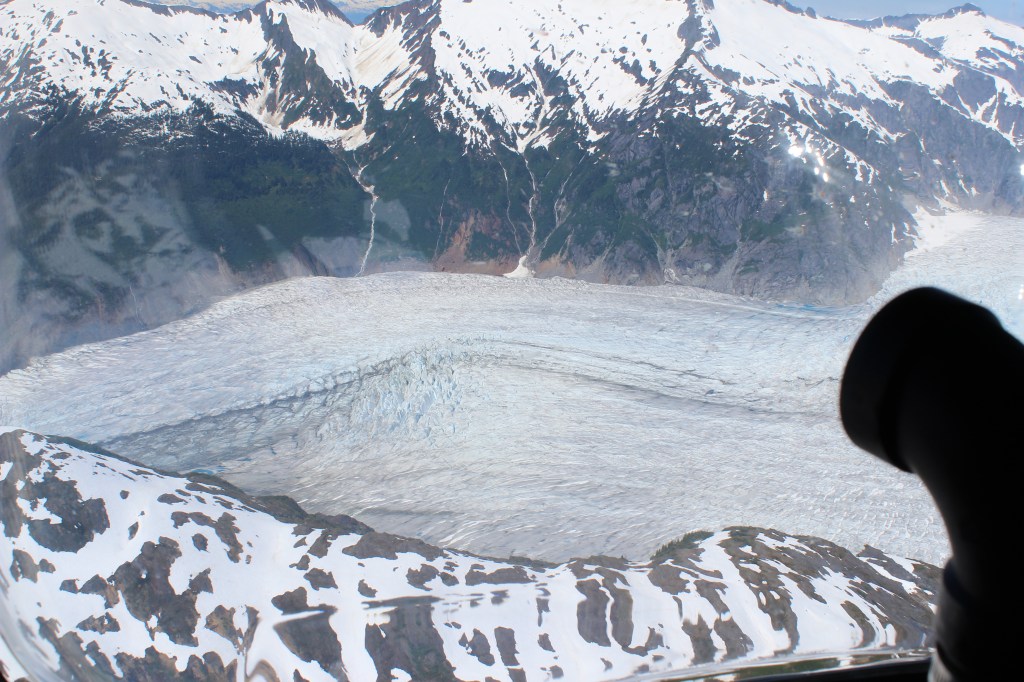 The guides will show you a quick safety video about making sure you heed their directions and stay in the yellow lines when entering and exiting the helicopter, and you’ll have to sign the waiver in case you forget and walk into a blade. The ten minute helicopter ride is the most beautiful scenery your eyes will ever behold, there above the snow-capped mountains with rivers, streams, and creeks the basins for the outpouring of melting glacial ice plummeting to the depths below, attracting krill – and therefore whales – to these waters. And then – – then – – then, you round a mountaintop and there below, you see the spectacularly striated Mendenhall Glacier, with its variegated white and blue layers of ice. It’s nothing short of spectacular, and you have to catch your breath for a moment. The beauty up and slaps you square in the face.