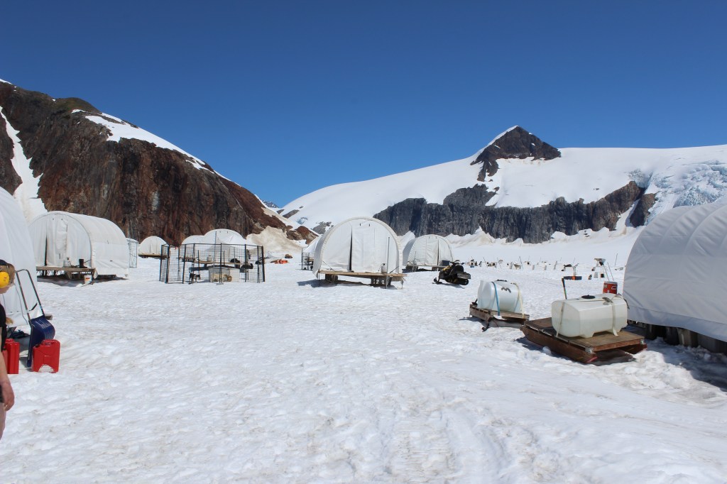 You see the equivalent of flotsam and jetsam in the snow below and wonder what in the world it is, and through your helicopter earphones they tell you. That’s dog camp. There’s a United States flag and an Alaska flag staked right in the 30 feet of snow that you’ll be walking around on in the glacier boots that fit snugly over your own shoes and gather your pants at the ankle shins, buckling tightly there to keep your legs warm.