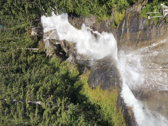 The guides will show you a quick safety video about making sure you heed their directions and stay in the yellow lines when entering and exiting the helicopter, and you’ll have to sign the waiver in case you forget and walk into a blade. The ten minute helicopter ride is the most beautiful scenery your eyes will ever behold, there above the snow-capped mountains with rivers, streams, and creeks the basins for the outpouring of melting glacial ice plummeting to the depths below, attracting krill – and therefore whales – to these waters. And then – – then – – then, you round a mountaintop and there below, you see the spectacularly striated Mendenhall Glacier, with its variegated white and blue layers of ice. It’s nothing short of spectacular, and you have to catch your breath for a moment. The beauty up and slaps you square in the face.
