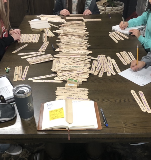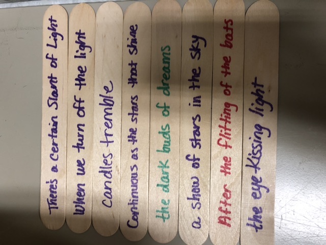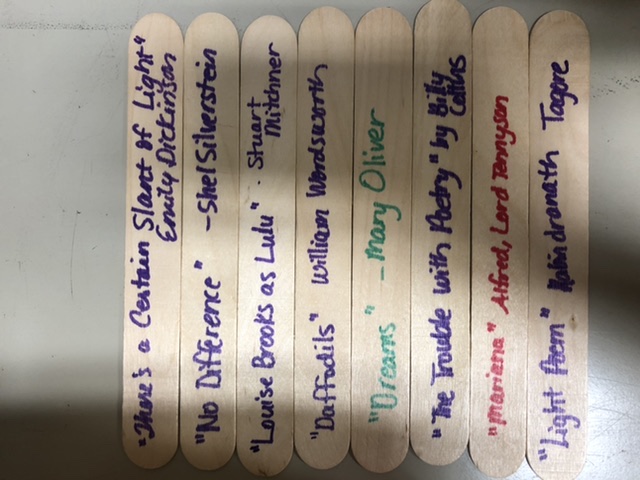 Students write found poetry using a bank of dreamsicle sticks with lines of poetry on one side, title and author on the flipside.