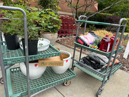 I thought of this yesterday while getting birdseed. I needed to at least replace the plant Dad intended me to have. I asked the flora specialist if they had any, and they immediately got on the radio and took me to the table where there were two left. I placed both on my cart and headed to the clearance planters. I’m not picky when it comes to planters. I chose two at half price, and my husband remembered I’d need the watering trays to go underneath them.