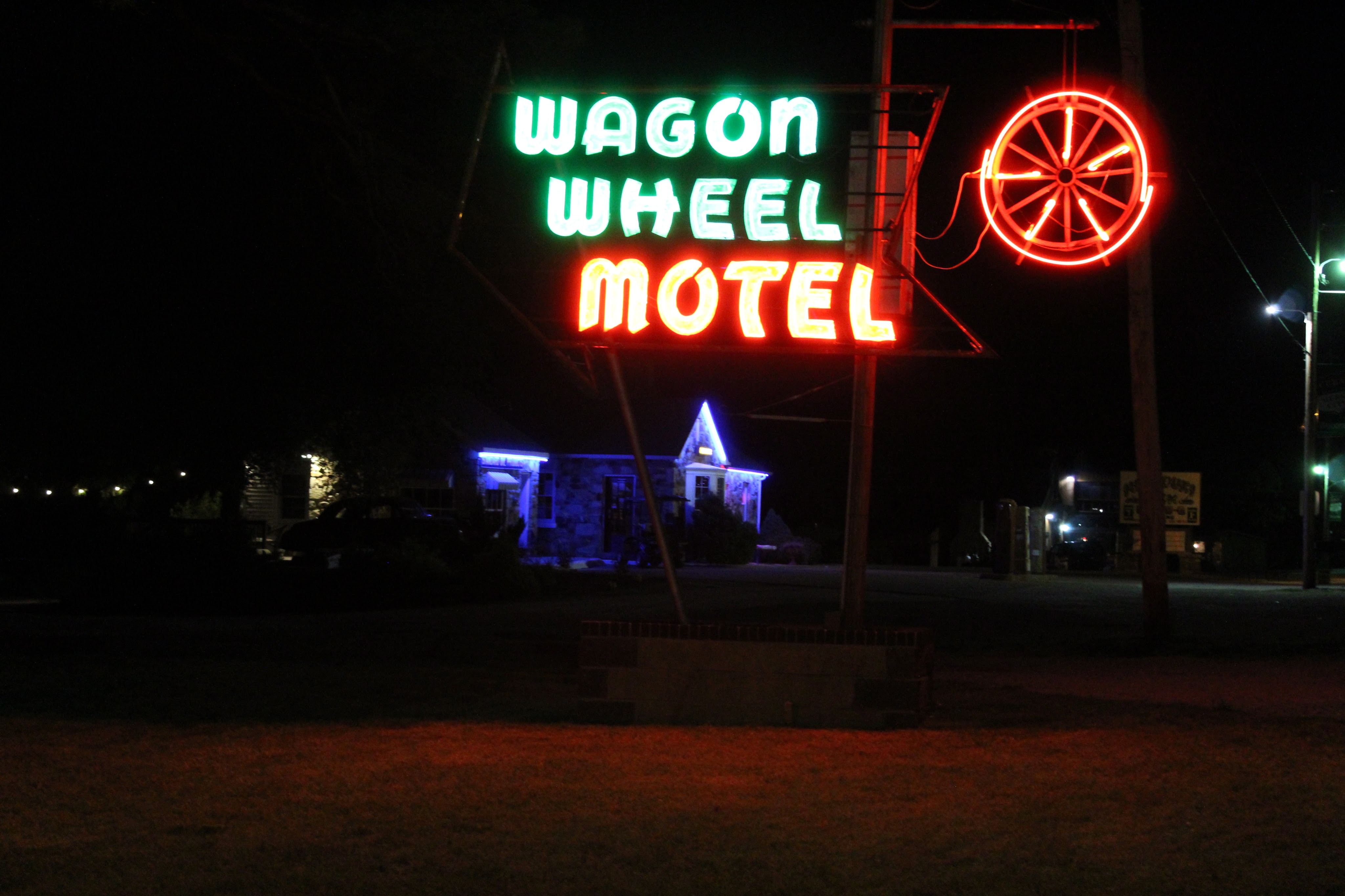 We made our way to Tucumcari, New Mexico yesterday along Route 66 and stayed at the Blue Swallow Motel, said to be the most iconic motel along the entire route. It’s a neon dream on the National Register of Historic Places, and is one of the only remaining true motorcourts in the United States today. Guests park their cars in the little garages next to the rooms. Each garage has a theme – ours is the movie Cars. The rooms are decorated with vintage lamps and furniture, right down to the chenille bedspreads, shower fixtures, bathroom tiles, and the working rotary telephone.