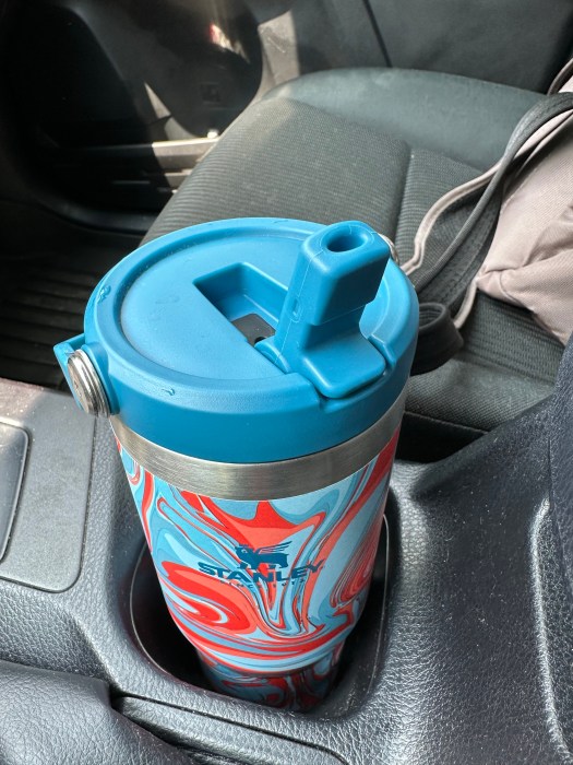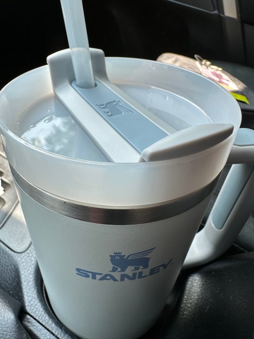 I was looking for a tumbler that is leakproof, that can get me through 3 or 4 hours without a refill, and that can keep ice cold overnight. I stuck to the name brands not because of their popularity on TikTok (which I don’t even watch), but because I tend to be very hard on shoes, bags, and cups and feel that name brands bring a durability that knockoffs don’t always offer. Plus, I have fond memories of Stanley since childhood when my grandfather took us camping in Fernandina Beach and drank coffee from his Stanley thermos all day. When he wasn’t on vacation, he took that thermos, with its side luggage-like handle, to work with him every day. Perhaps that’s why my heart leans toward Stanley products.