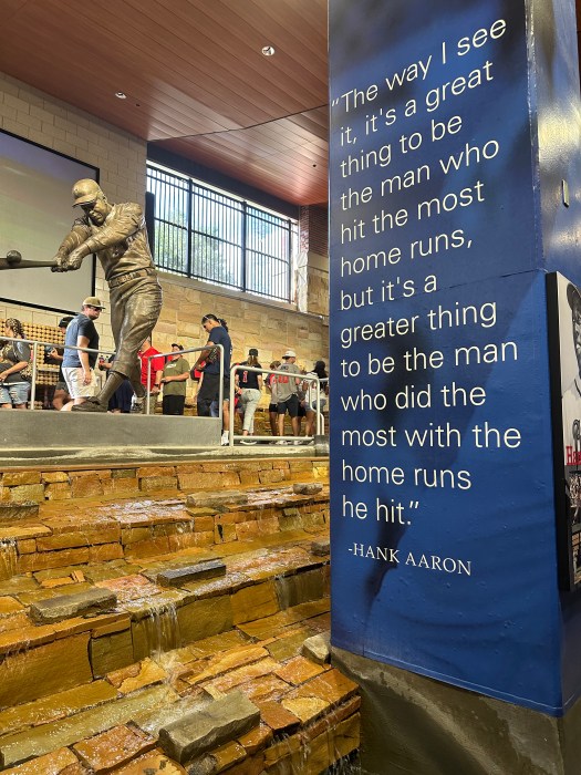 It wasn’t walking around the park looking at all the great things to see, either, from the jerseys for sale overhead moving along on a clothes belt similar to a dry cleaner’s, or the Braves Hall of Fame or the tribute to Hank Aaron with the waterfall.