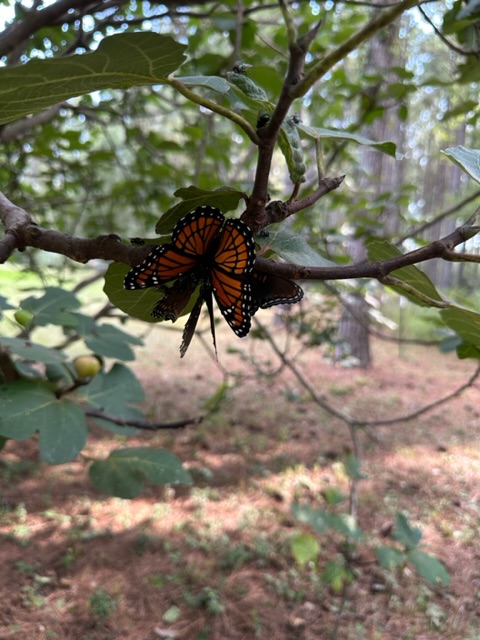 Monarchs and Black Swallowtails feast on the last remnants of the withered figs.