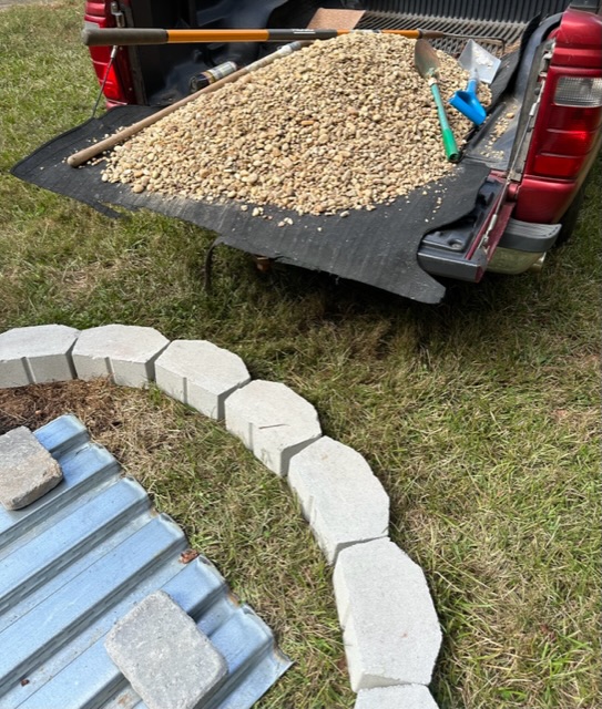 Several years ago, we’d had a load of gravel delivered for our rock beds, so we jumped in the farm pickup truck and drove over to the gravel pile. We raked it off and used a load of this for the base rock under the pit. We positioned the tailgate over the center and offloaded the gravel, spreading it out as a base layer.