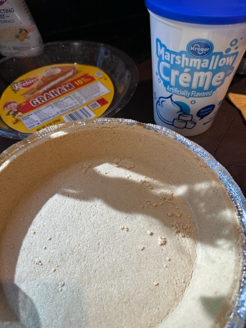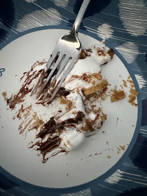 Graham cracker crust with marshmallow and chocolate Baked and then browned on top Rich and sweet but everyone liked it Dinner and dessert by the fireWe added Campfire Colors for a dazzling show!