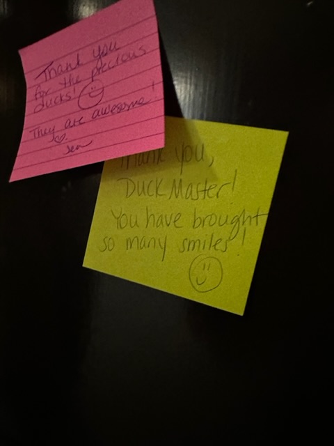 Tiny ducks keep popping up everywhere! Who could be doing this, sneaking into the office under the cover of darkness to let these cuties in, bringing smiles and prompting Post-It notes of thanks to “The Duckmaster?” No one knows.