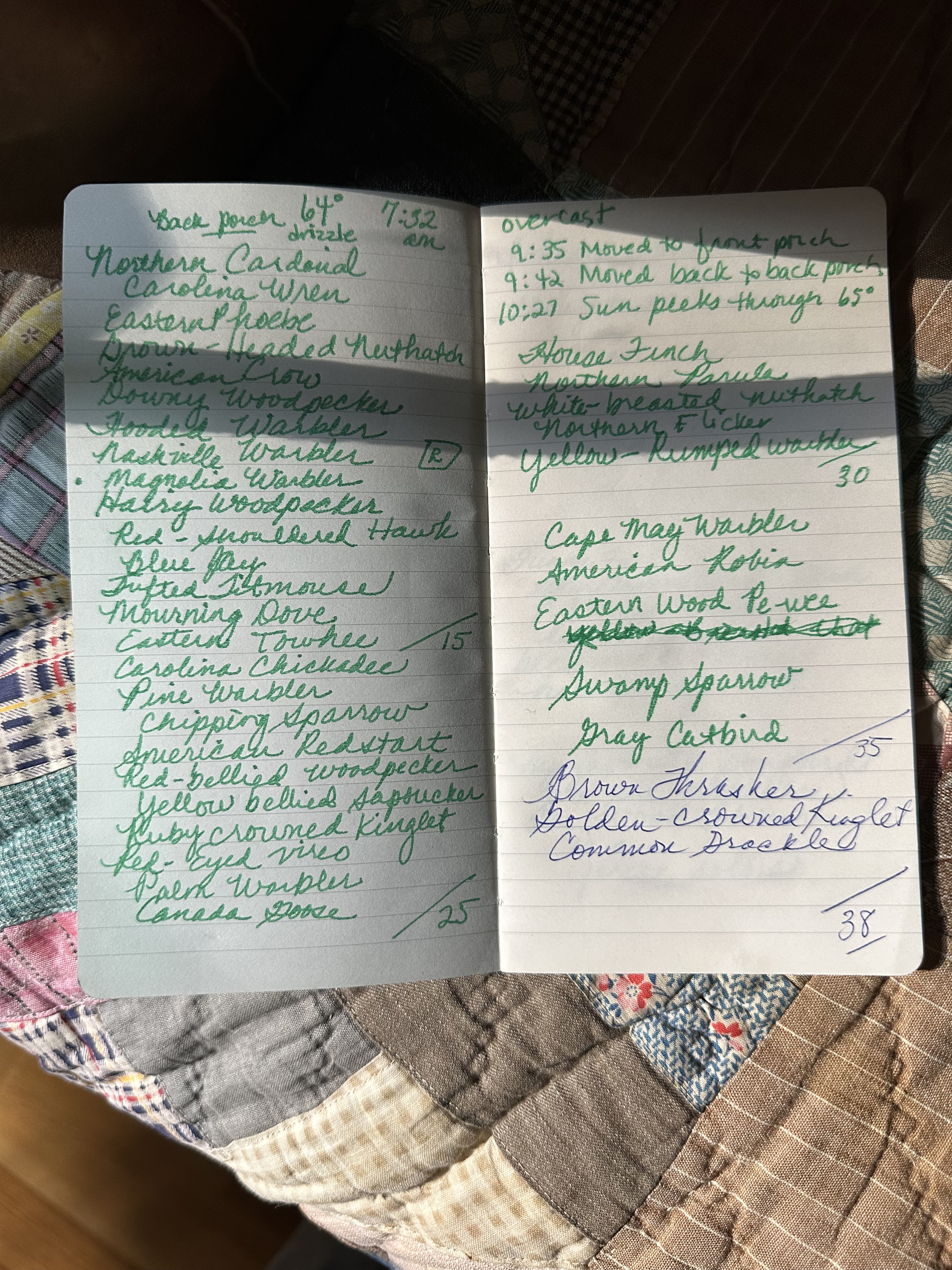 Update: I logged 38 species today - I have included my list above, with several appearances by my colony of warblers - including the rare Nashville Warbler!
