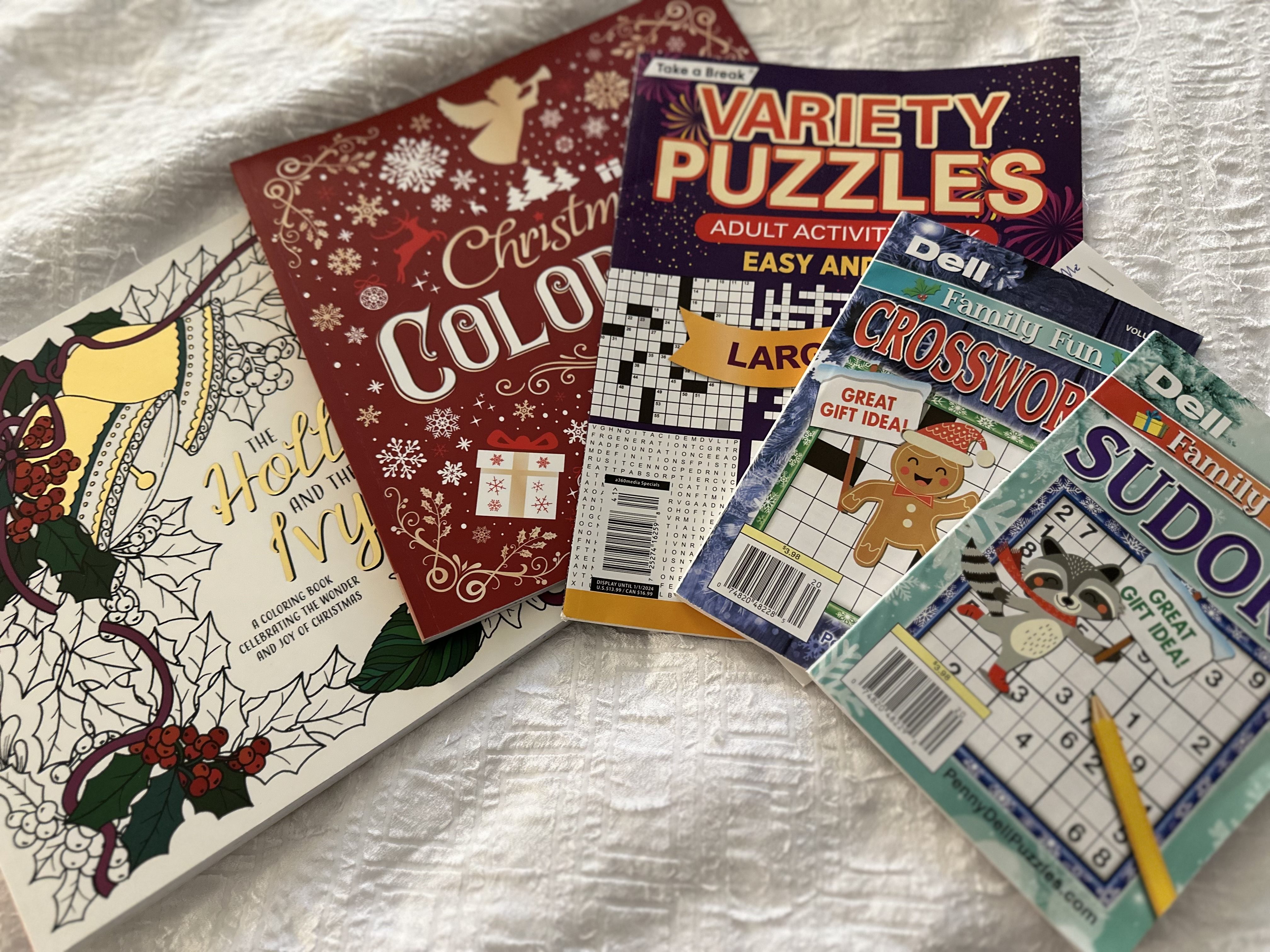 Anticipating the time we would be spending together, I also decided to bring some sketch books, puzzle books, and Christmas coloring books for adults. And I brought the smooth colored pencils that I scooped up back in the good old days when Hobby Lobby still had the daily item for half price with the online coupon. My guess is that they couldn’t keep Scholar Prismacolor oil-based pencils in stock, so they had to stop that kind of giveaway.