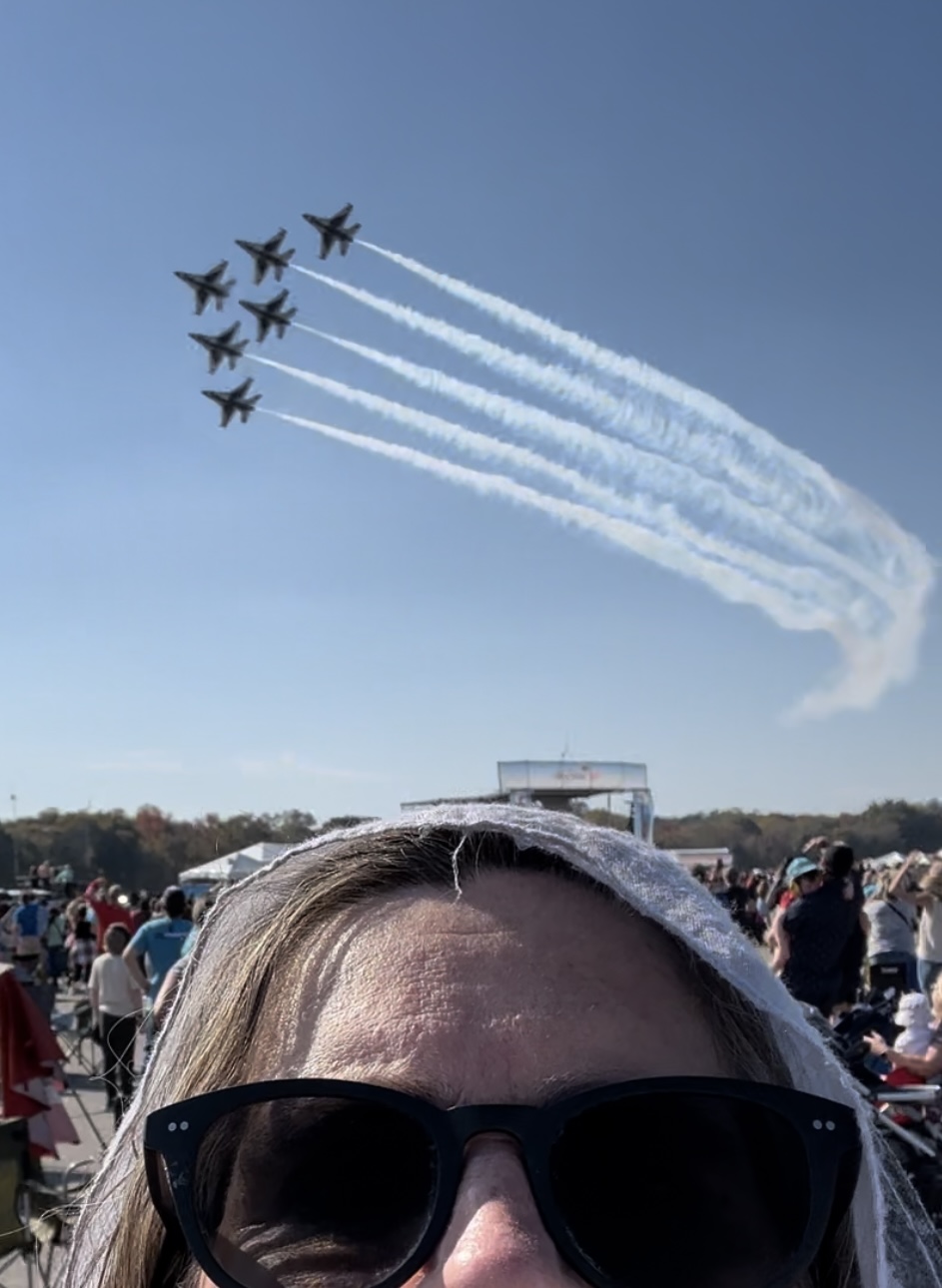 I was wearing my darkest sunglasses and trying my best to prevent a bout of vertigo with the interplay of the heat, the light, and noise, and the disorienting focus of trying to keep my eyes focused on the show jets overhead, to the left, to the right, right side up and upside down.