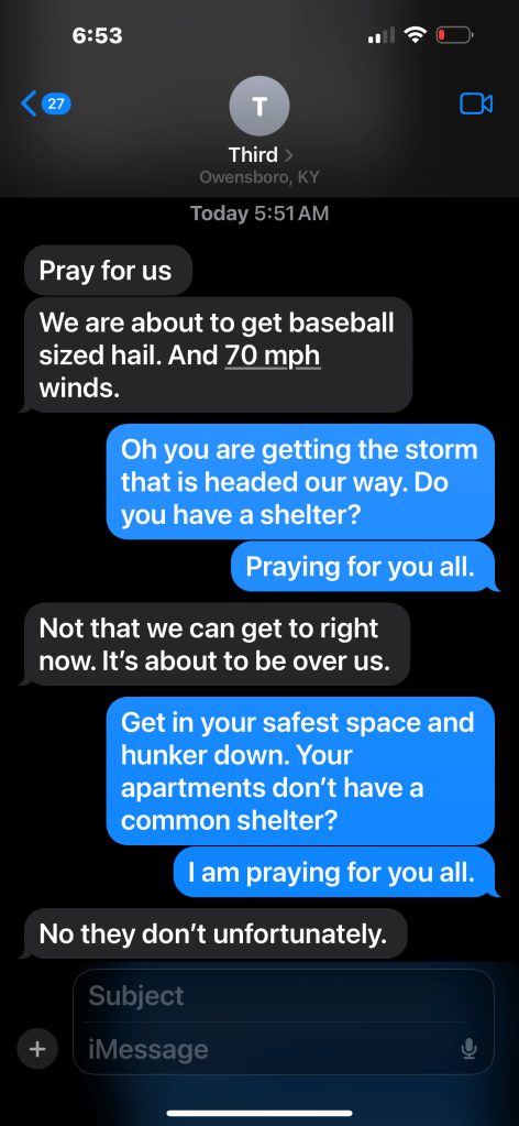 Leilya Pitre of Louisiana’s prompt at http://www.ethicalela.com can be read in full here. She inspires us to write poems about the Ides of March with its foreboding feeling of doom.. While my time slice today is 12:28-12:59, I can tell you that during that 31-minute segment of my day, I’ll be praying and moving plants indoors and securing outdoor furniture to prepare for the storms my daughter is experiencing this morning in Owensboro, Kentucky that are heading our way this evening. Everyone has been anticipating and preparing for these storms all week. Right now, I’m praying for my children who are enduring baseball-size hail and 70 mph winds in their first round this morning.