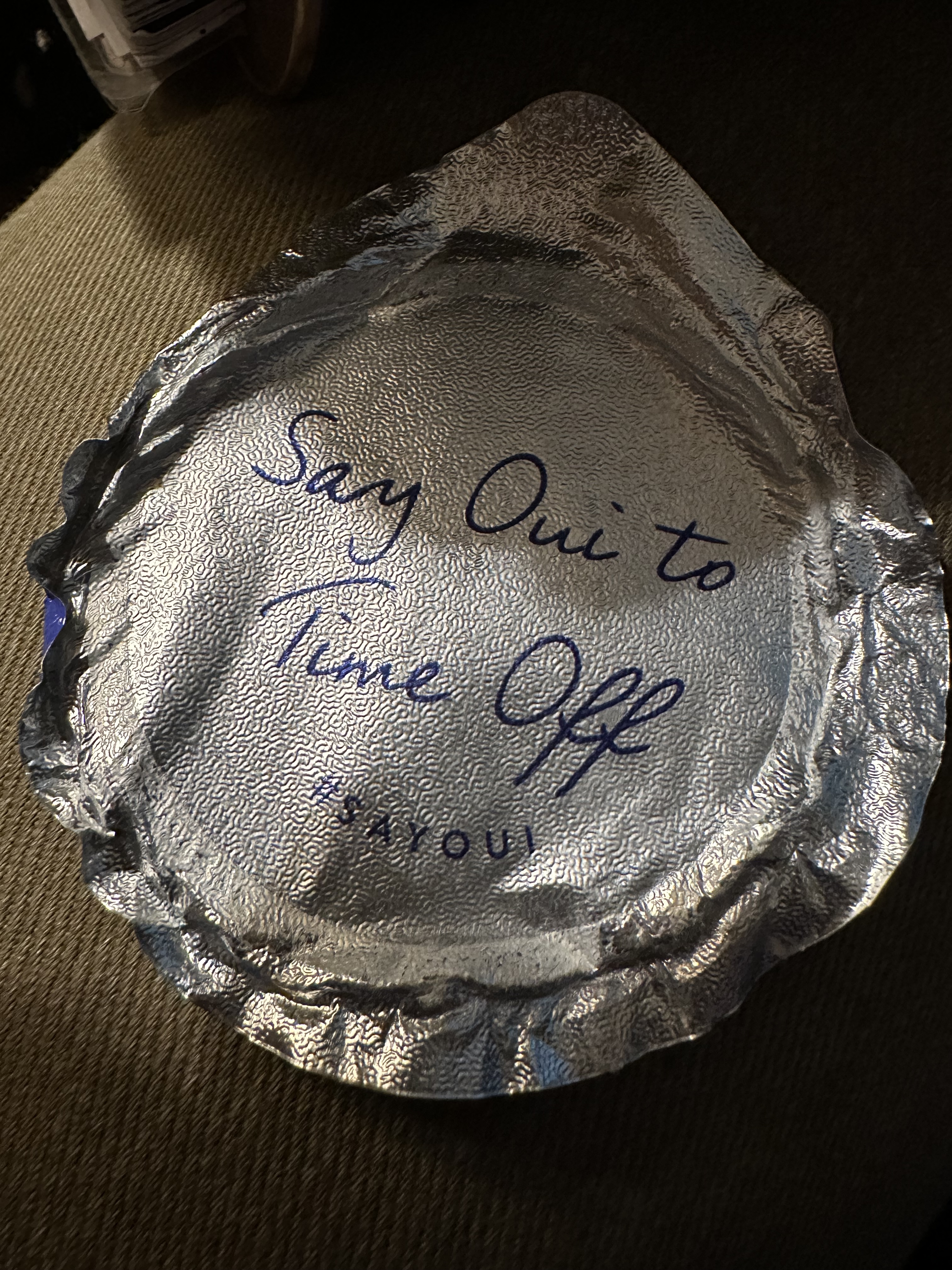 I find inspiration in the lids of the yogurt I eat. I buy this brand not just because it’s delicious, but for the messages and the pure glass containers that will root new plant life for me to share with friends. Here is a poem inspired by Say Oui to Time Off!