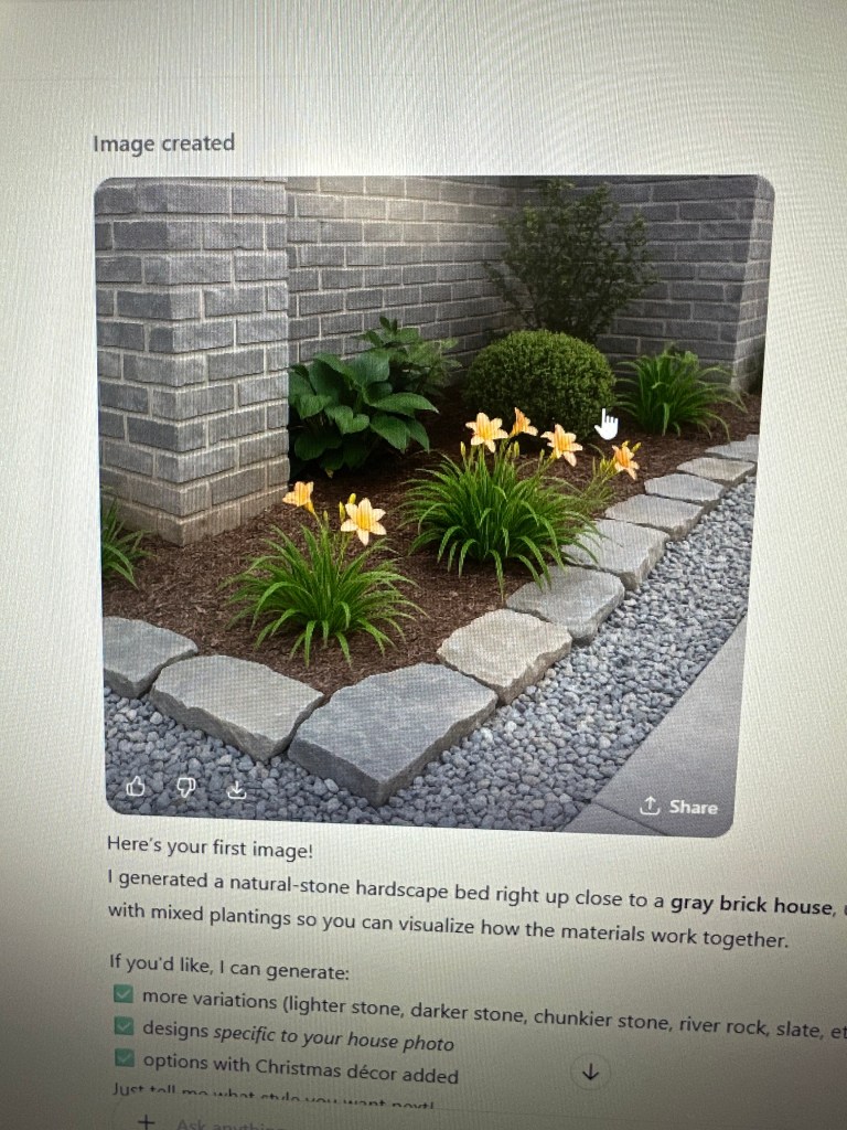Chat doesn’t understand that our sidewalk runs in a different direction, but it does understand that we needed to see the concept of the design. We’ve decided on small black polished river rock to finish the bed, and we will work to that end…….meanwhile, we will have to re-vamp the budget and decide when to add the additional features.