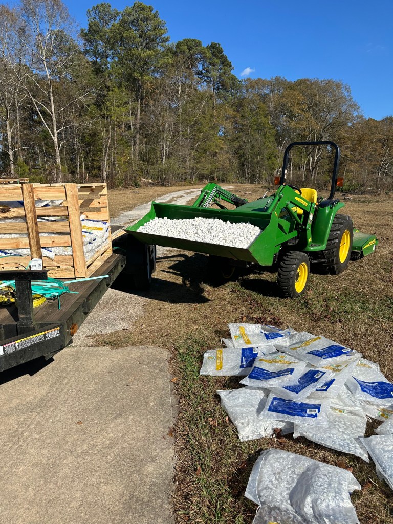 We used the tractor to make the work load lighter. We emptied the bags of rock right into the bucket and used the bucket to hep spread the rock.