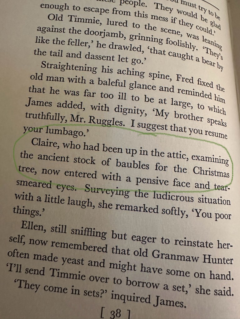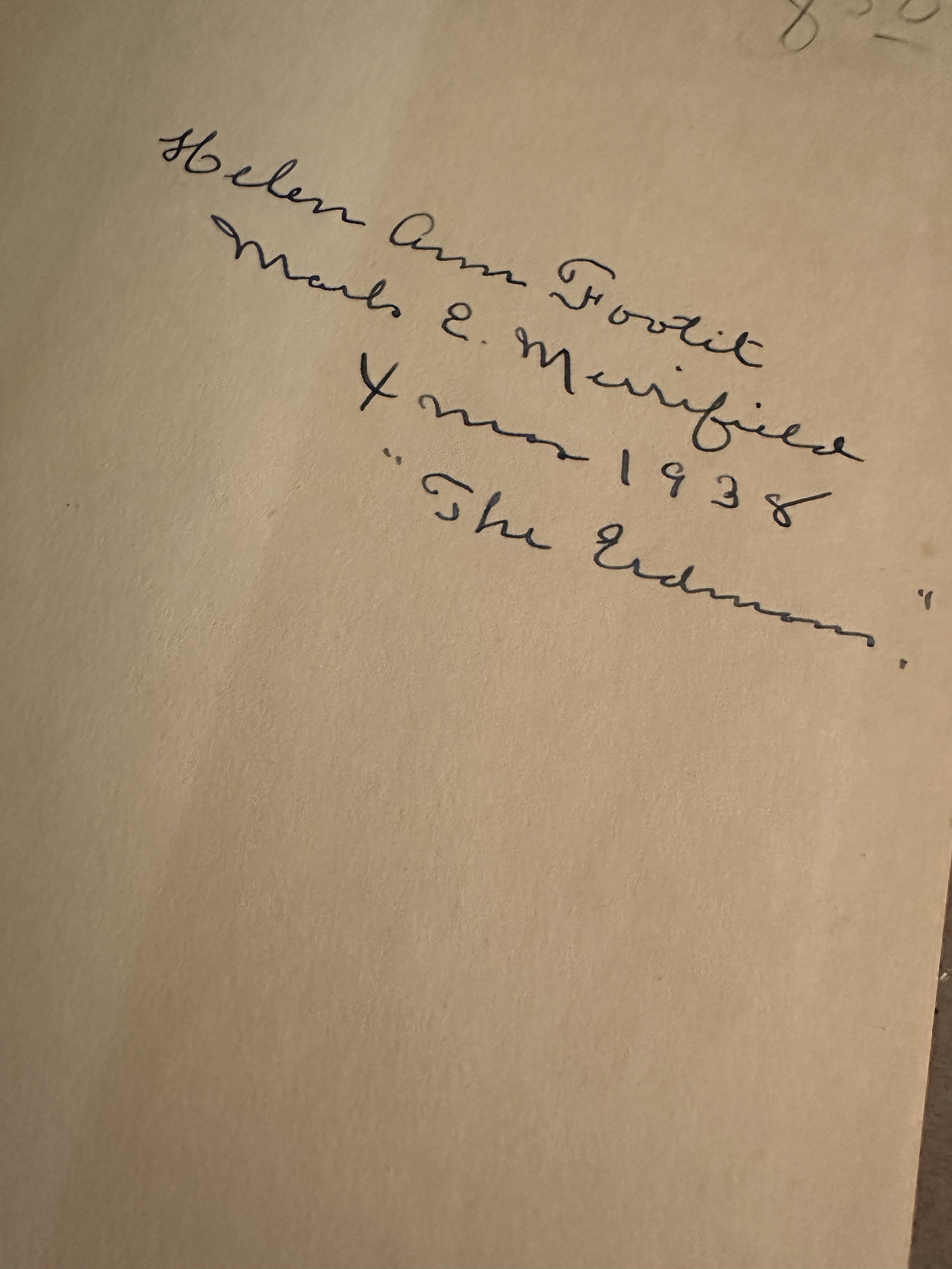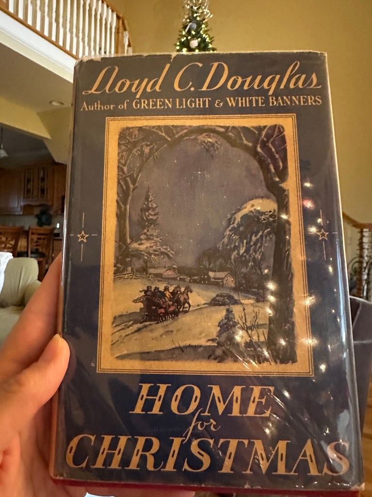 Christmas is the most enjoyable time of the year for me to thumb through books and hang on lines. Home for Christmas by Lloyd C. Douglas is one I chose for today, and I’ve included photos of the front and back covers of the book along with the inscription. This was a gift to Helen Ann Footit from Mark E. Merrifield for Christmas in 1938 after its first printing in 1935. It’s a gift to hold a piece of living history and wonder about the person who first opened it, and whose eyes have swept the pages, whose fingers have graced the words, and where they laughed. I wonder about the nature of the gift and the relationship of the giver and recipient. Was this an uncle and niece? a man courting a young woman? What is meant by “The Erdmans?”