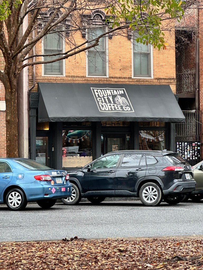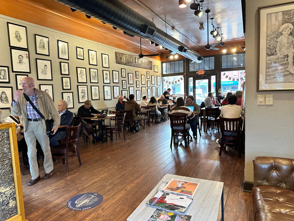 The Chalice in Golden is the fictional version of Fountain City Coffee Company, which sits on Broadway, a downtown street in Columbus Georgia two blocks east of the Chattahoochee River that divides Georgia and Alabama. This is where we started our adventure on a rainy Sunday. We ordered coffee and muffins and sat at a table admiring the portraits on the wall – wondering about the stories of each face.