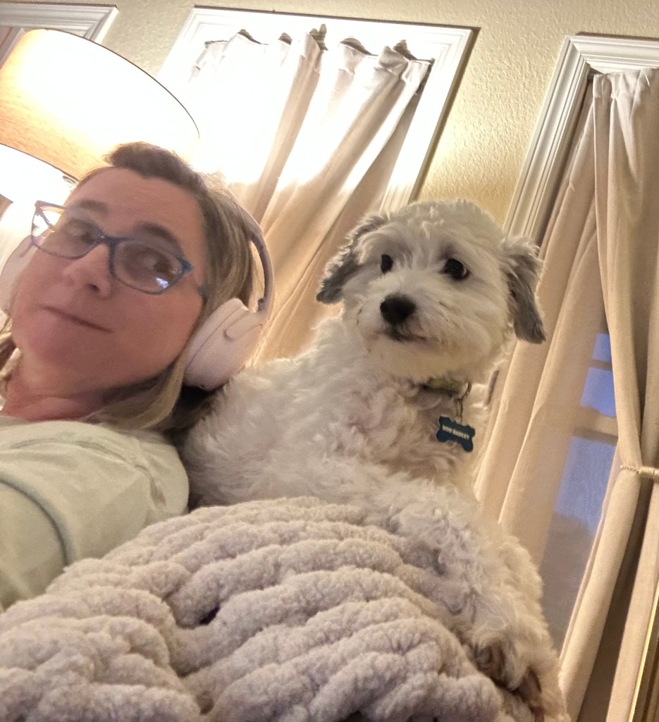 Boo Radley, our rescue Schnoodle with multiple issues, fears, and insecurities, just likes to be close to us when we are settled and relaxing. His favorite thing is to get on the back of the chair and put his head on my shoulder, “sharing” my headphones. Every once in a while, as if on cue, he reacts to a poem in the same way I do……and I can feel it!