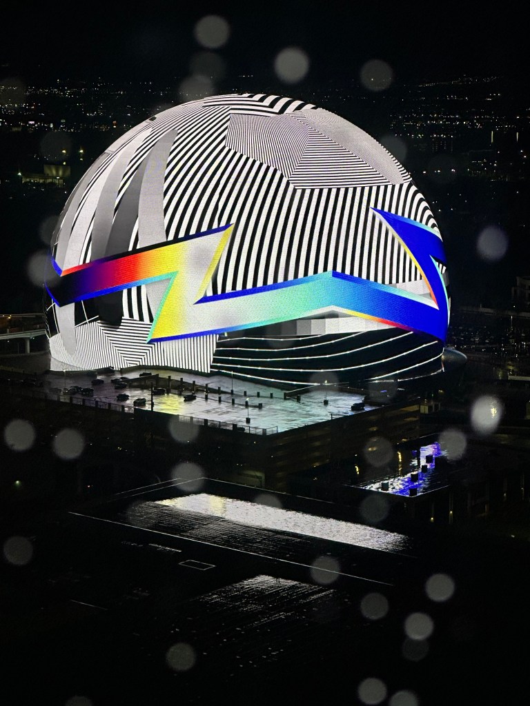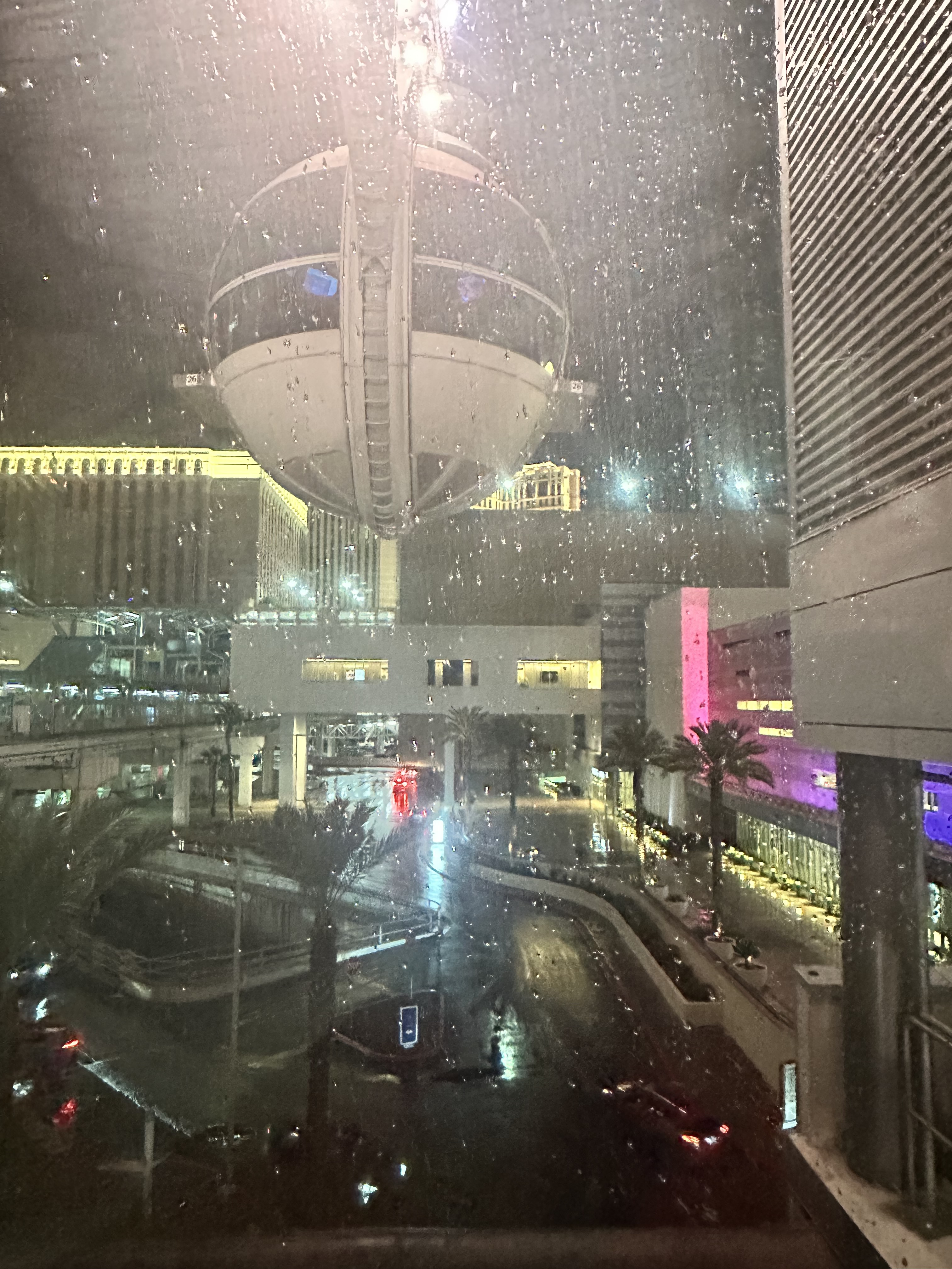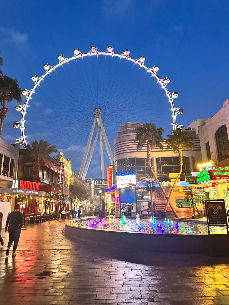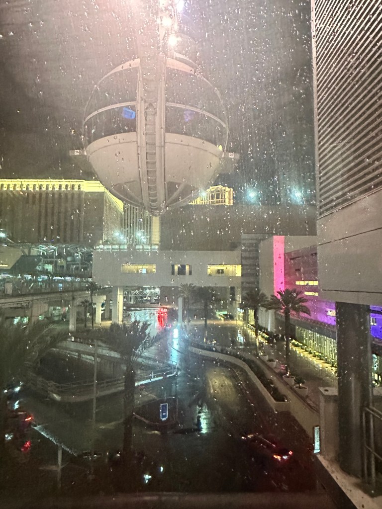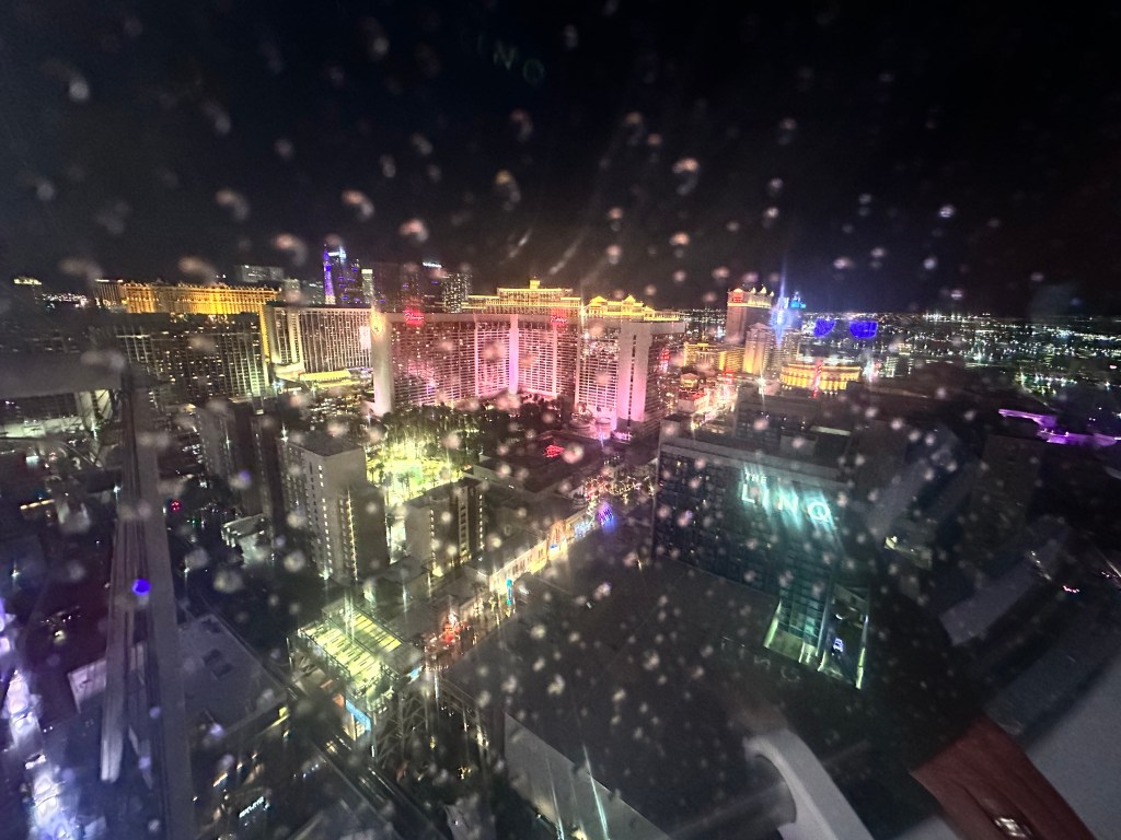She knows he loves lights – flashlights, landscape lights, Christmas lights, headlamps, city lights. And so on our first rainy night in “her city,” she took us on the High Roller. A surprise with him in mind. And we loved every minute of the half-hour spin seeing the city lights!
