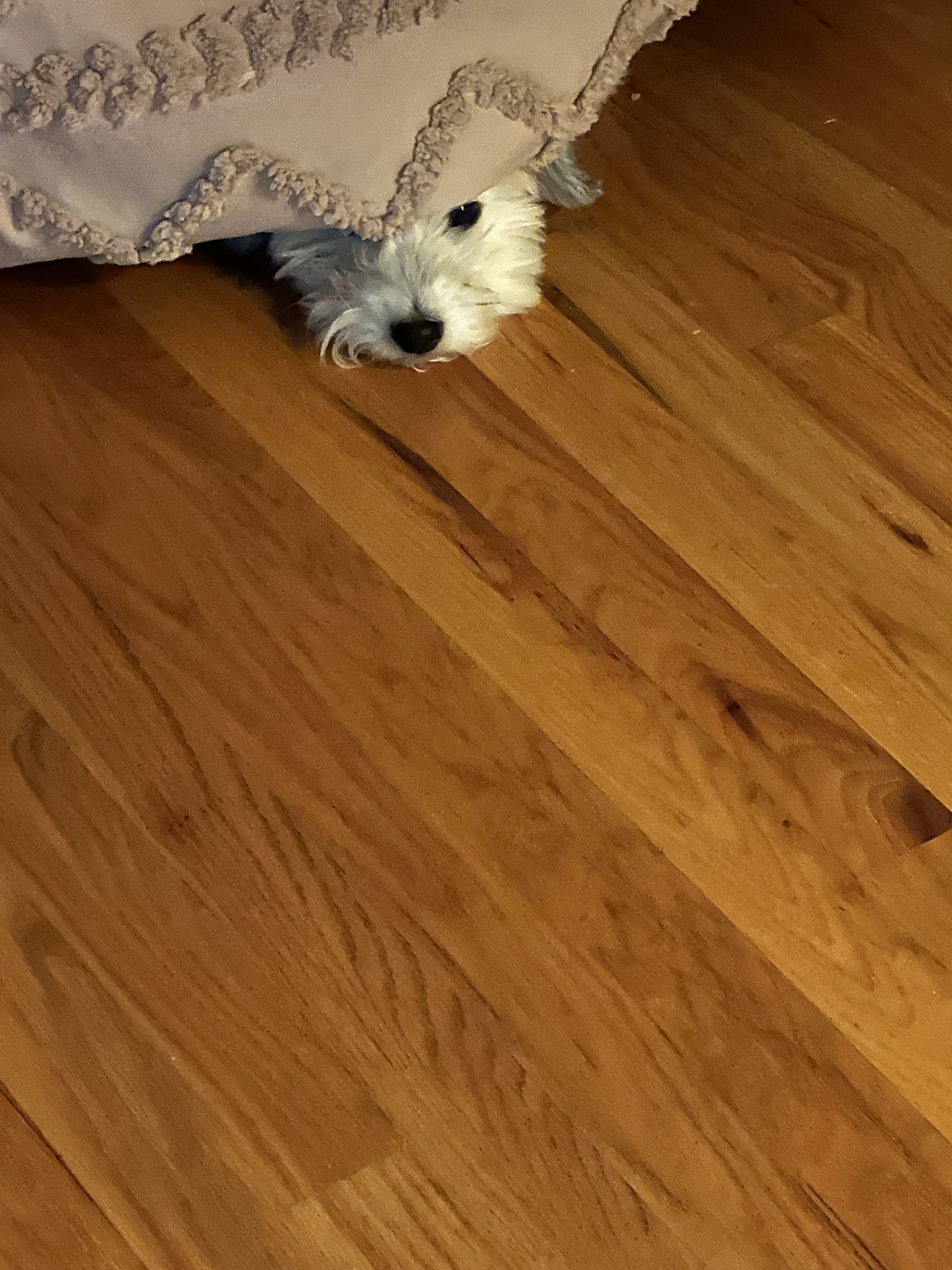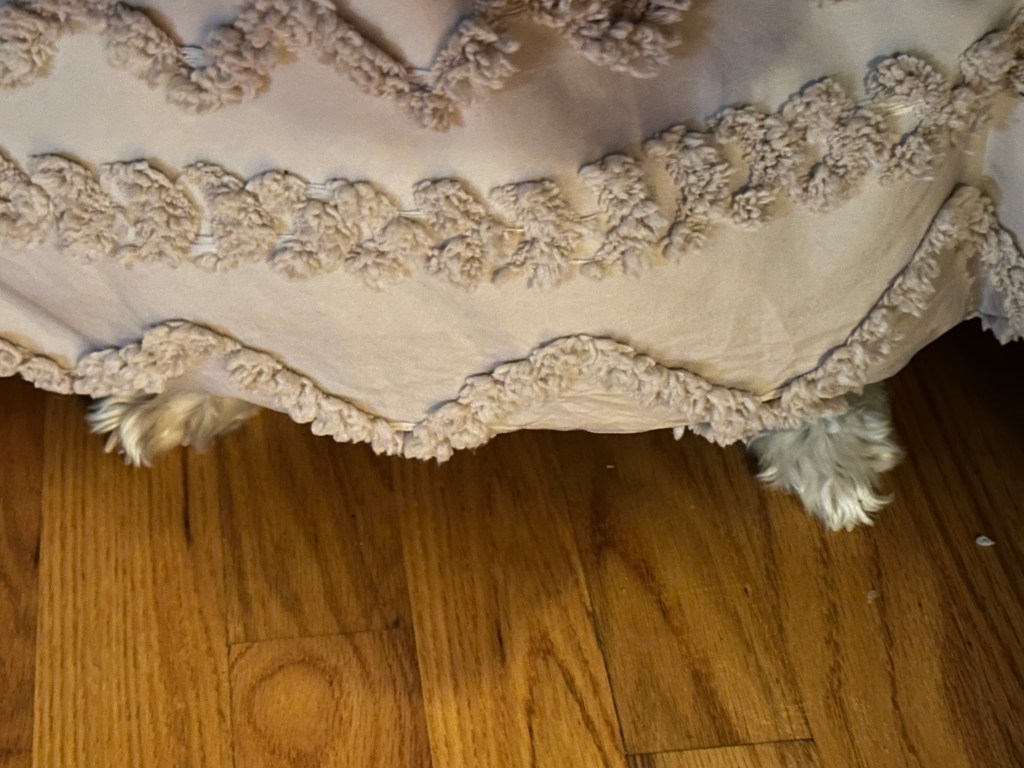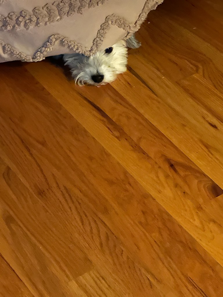 Boo Radley is our rescue Schnoodle who is as grumpy as they come. He growls for no reason and tries to bully his brothers. He may sound like he’ll rip your leg off, but when it comes to feelings, he’s a sensitive dog. When we have to fuss at him, he gets under the bed to repent of his sins and thinks we can’t see him if he barely puts his nose out.