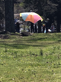 a circled family playing colorful parachute ball around a rainbow