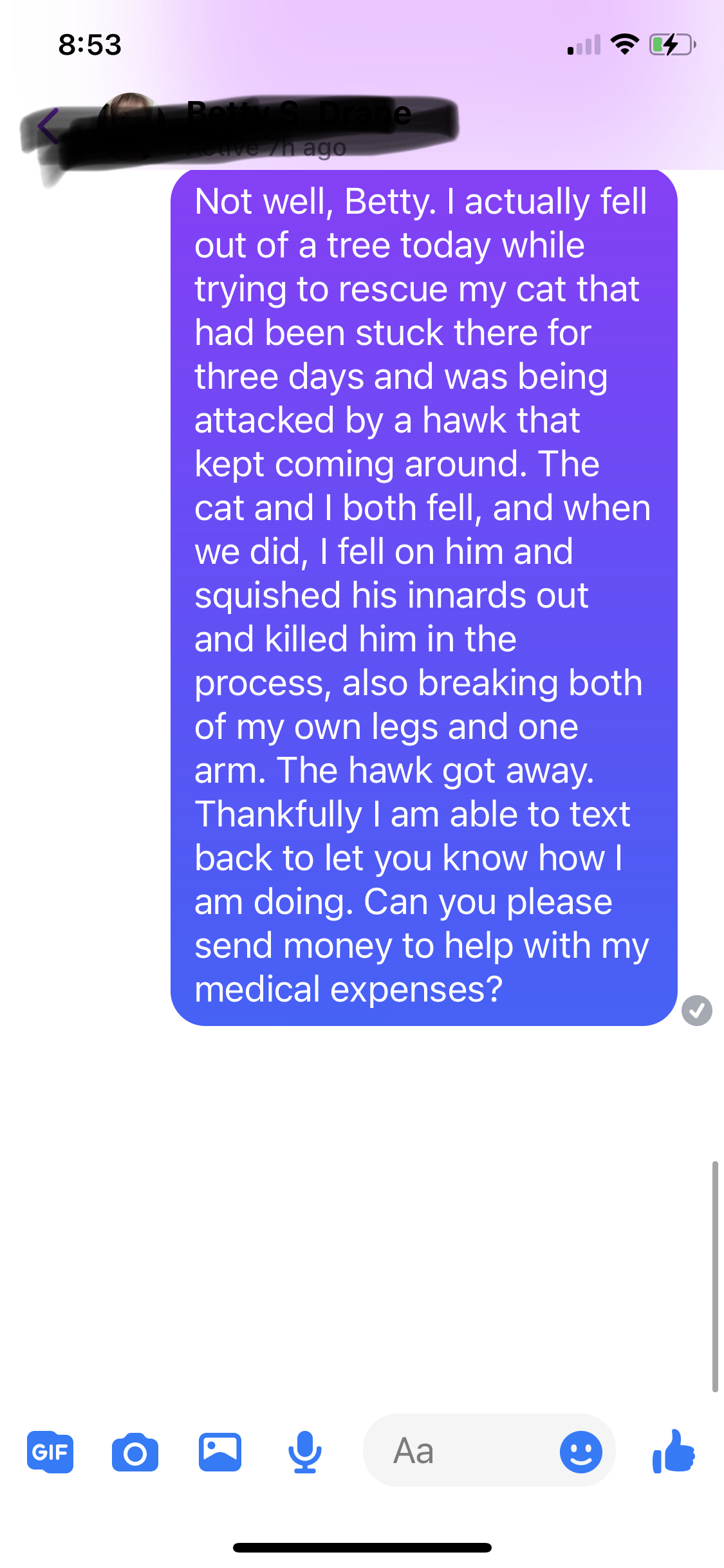 Not well, Betty. I actually fell out of a tree today while trying to rescue my cat that had been stuck there for three days and was being attacked by a hawk that kept coming around. The cat and I both fell, and when we did I fell on him and squished his innards out and killed him in the process, also breaking both of my own legs and one arm. The hawk got away. Thankfully, I am able to text back to let you know how I am doing. Can you please send money to help with my medical expenses?