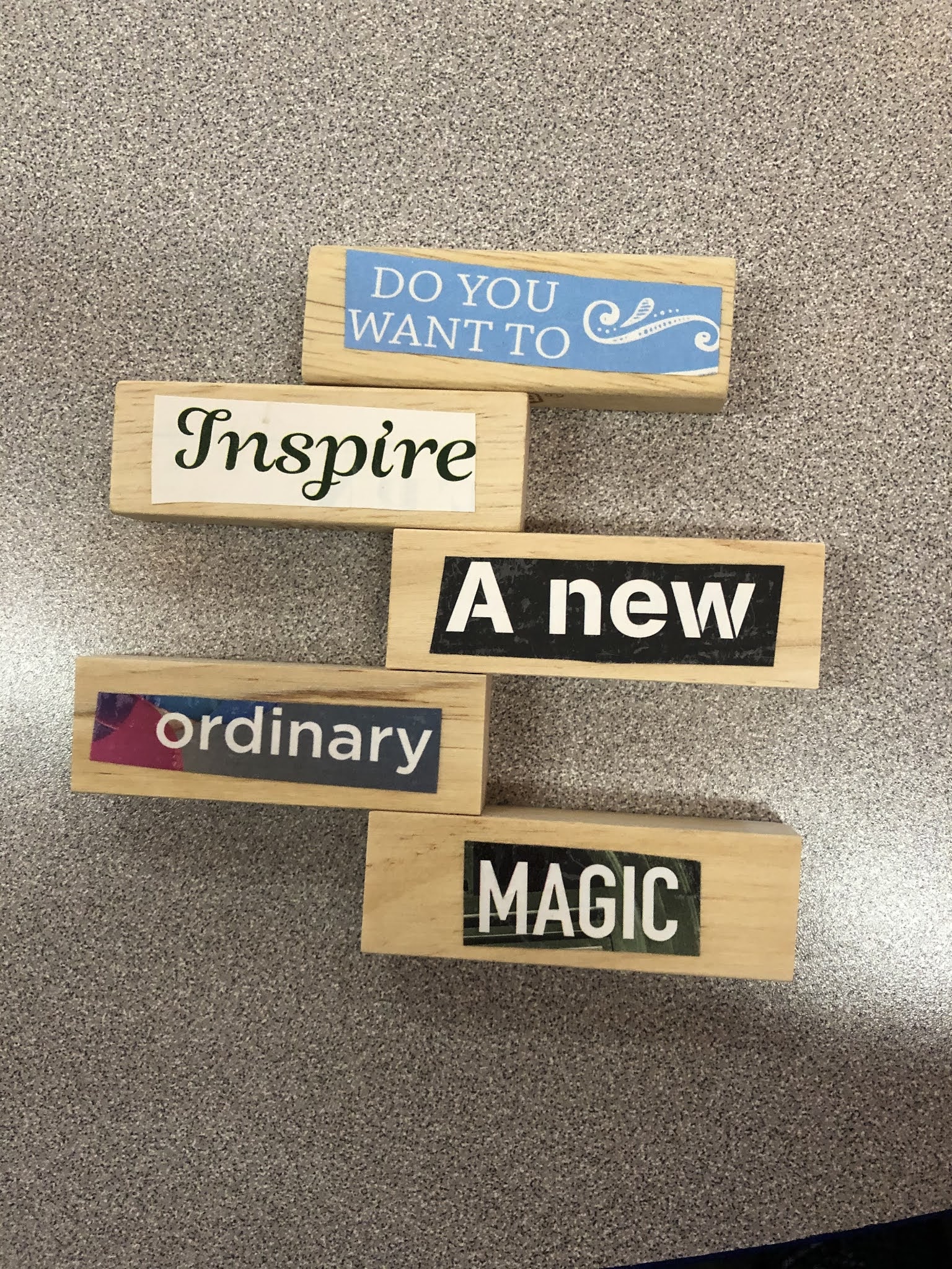 Blockhead Jenga – ask for donations of Jenga blocks or pick up sets at thrift stores. Cut colorful and interesting words from magazines to put on the blocks. Students can arrange these into verse.
