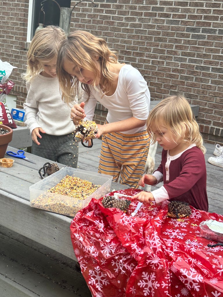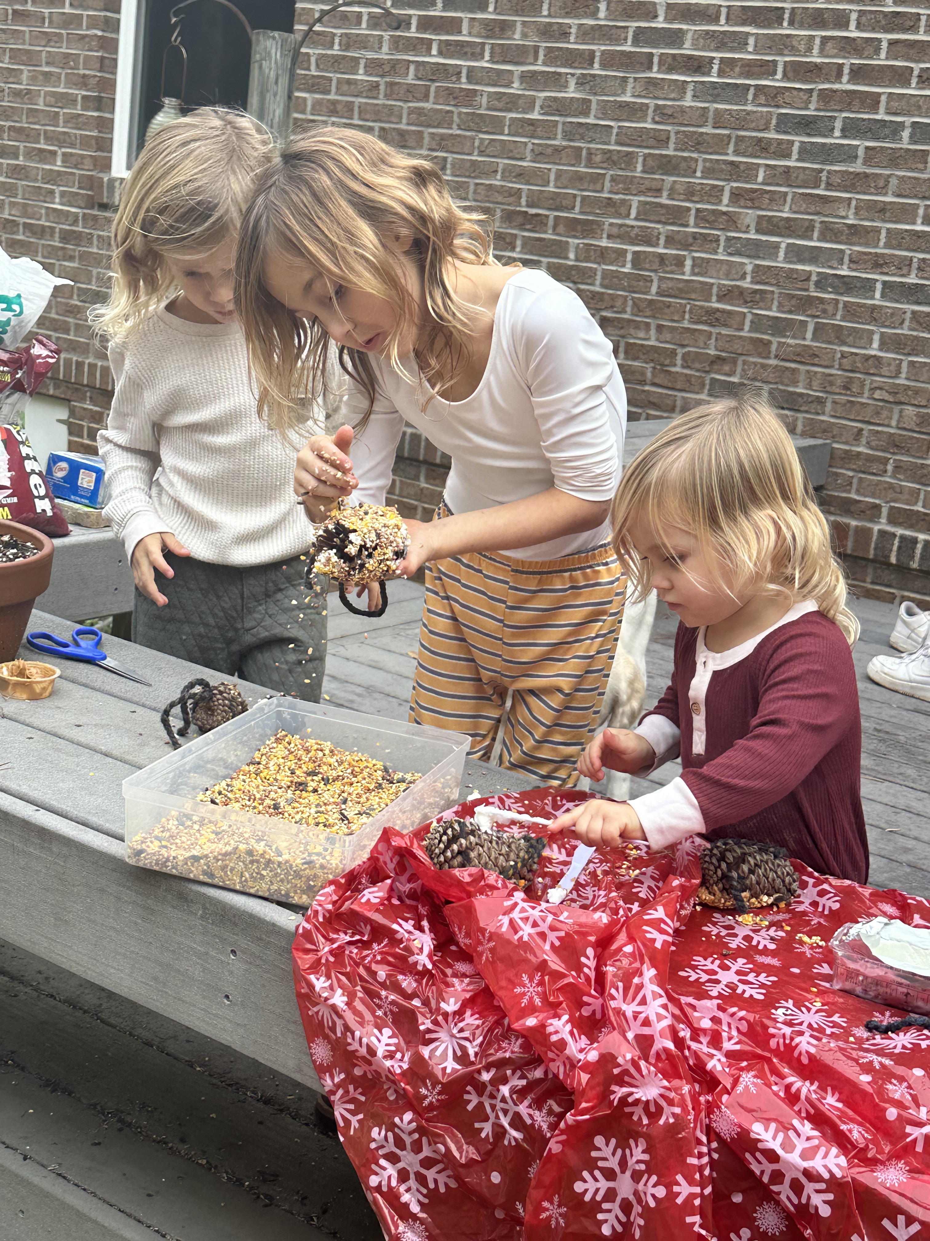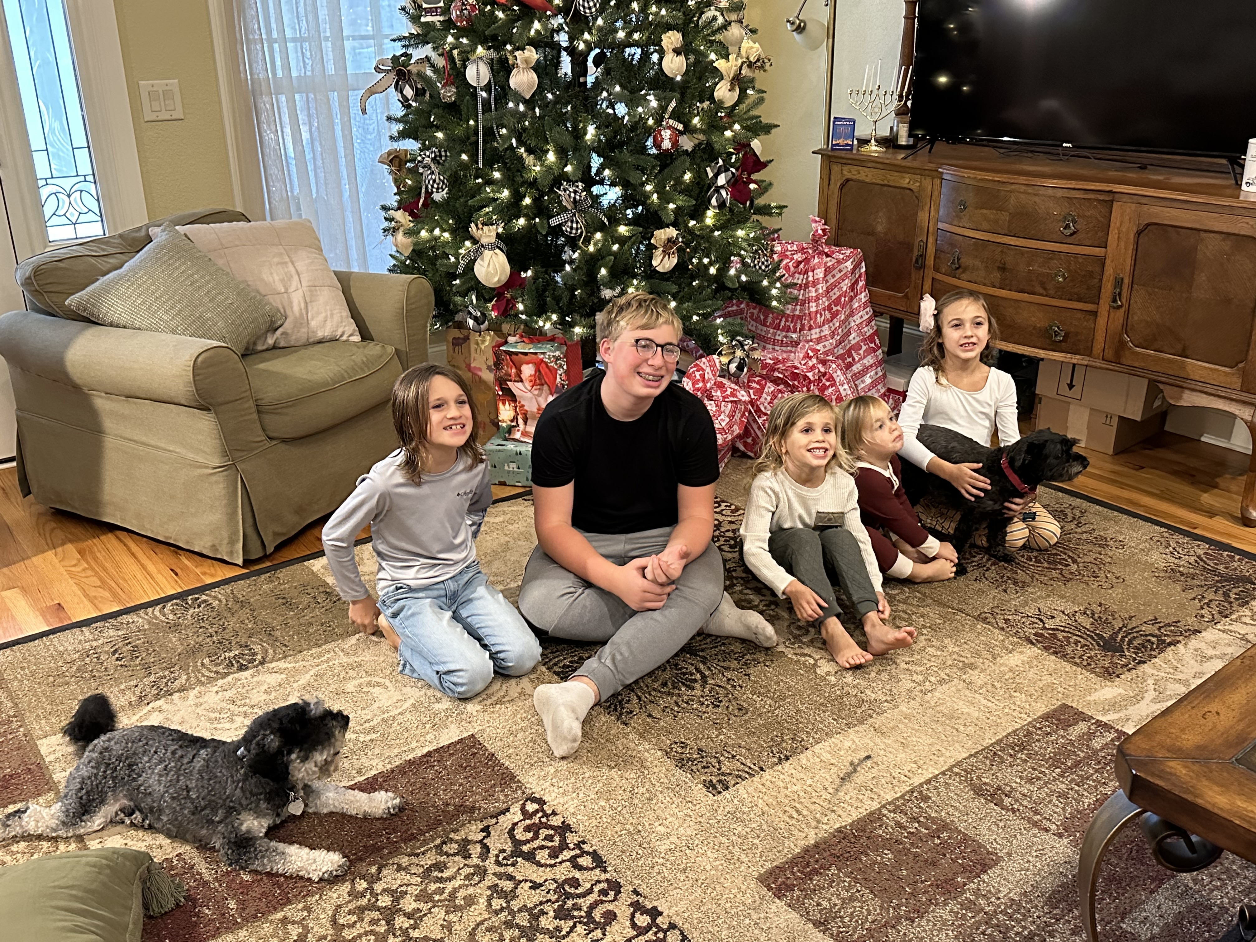 All six grandchildren are here with two parents, their three labs and the two of us and our three Schnoodles. The house has never been more alive than it is right now (you can actually feel its heartbeat thumping, pulsing with the energy of children). We celebrated Christmas together yesterday. During the weekend time, we have watched our small town’s Christmas Parade, baked and decorated Christmas cookies and pumpkin bread, made peanut butter fudge, cooked a big pancake breakfast, played outside and amassed Georgia red clay dirt stains from wrestling in the grass and playing King of the Hill, made pinecone birdfeeders and watched the birds come to an early Christmas feast, taken a walk with the dogs to look for the elusive “Lellow Bear” that has lived in these woods for many years, napped, visited a family friend at the fire station, opened gifts, played board and card games and dominoes because we gave away the Scrabble board, feasted on Lasagna and garlic bread, and ran inside from the drizzle that stopped our fireside marshmallow roast plans. We’ve taken a tour of the camper and talked about all the plants on the front porch, including the ways to propagate them for our nine year old environmentalist grandson to have snips of offshoots of these plant species (he already has five varieties of succulents and cactuses growing in his room). He has shown us how to make his favorite tea. We’ve taken some moments here and there to sit on the swing of serenity and have a brief time of peace before being discovered by someone needing less peace. We’ve thrown the ball down the hall for the fetching dog hundreds of times and tested stain removers on knees of pants and elbows of jackets and shirts. We’ve K-cupped multiple times a day to keep caffeinated enough to keep pace with the little ones and read books at quiet times.