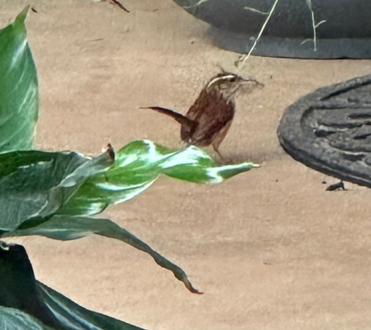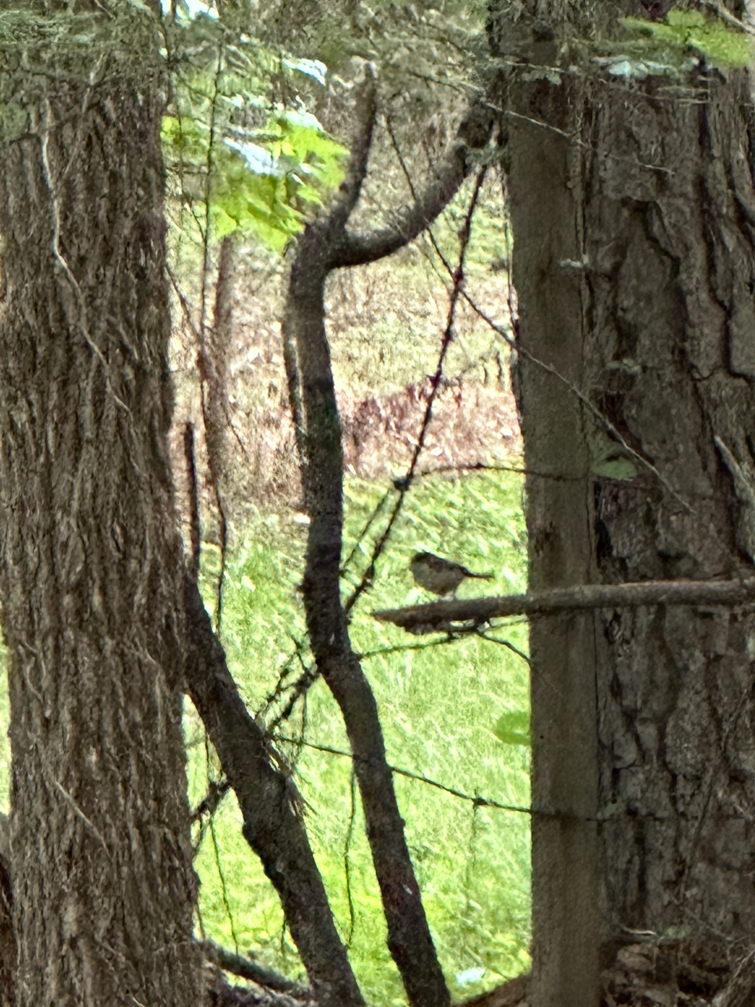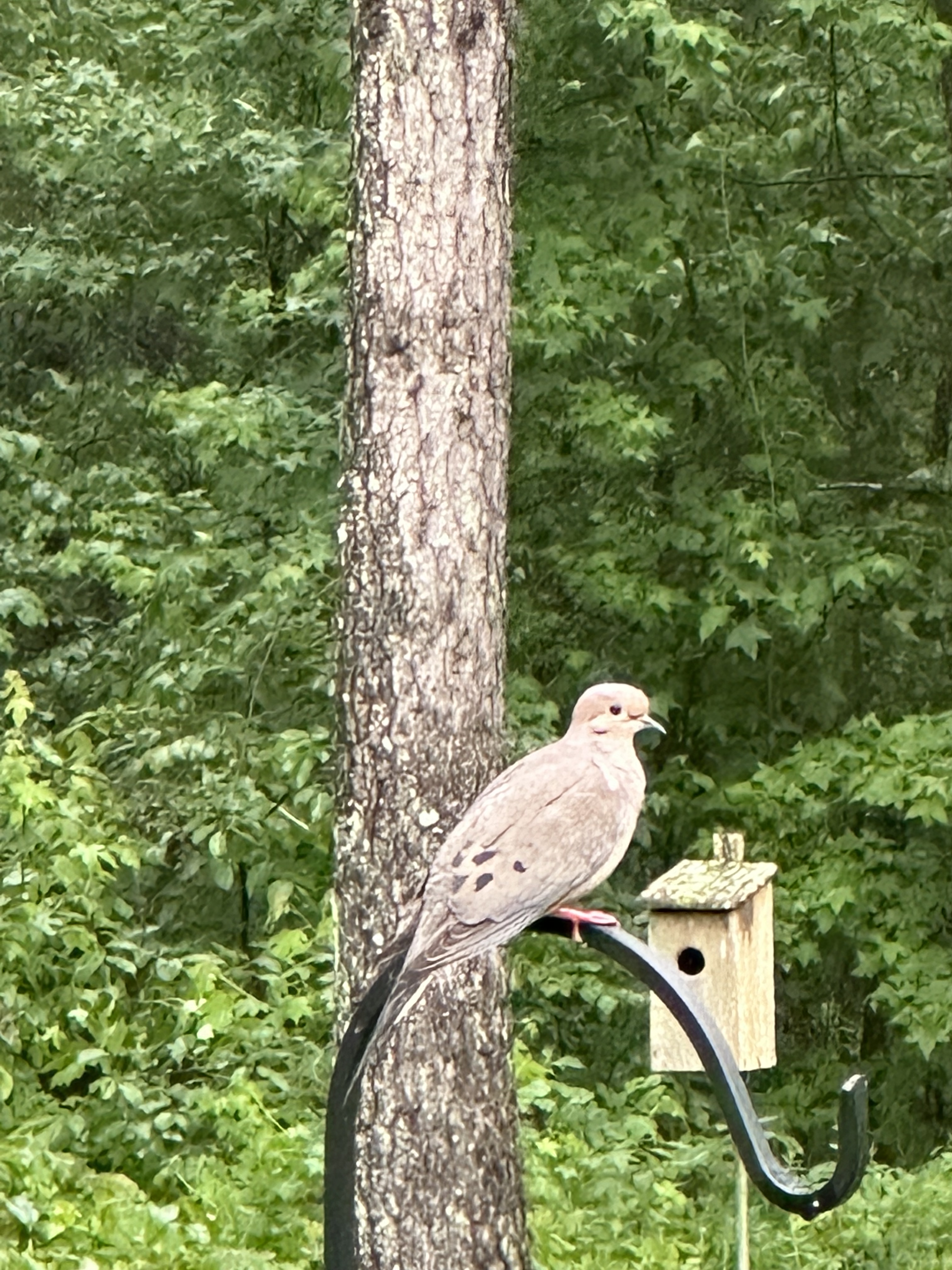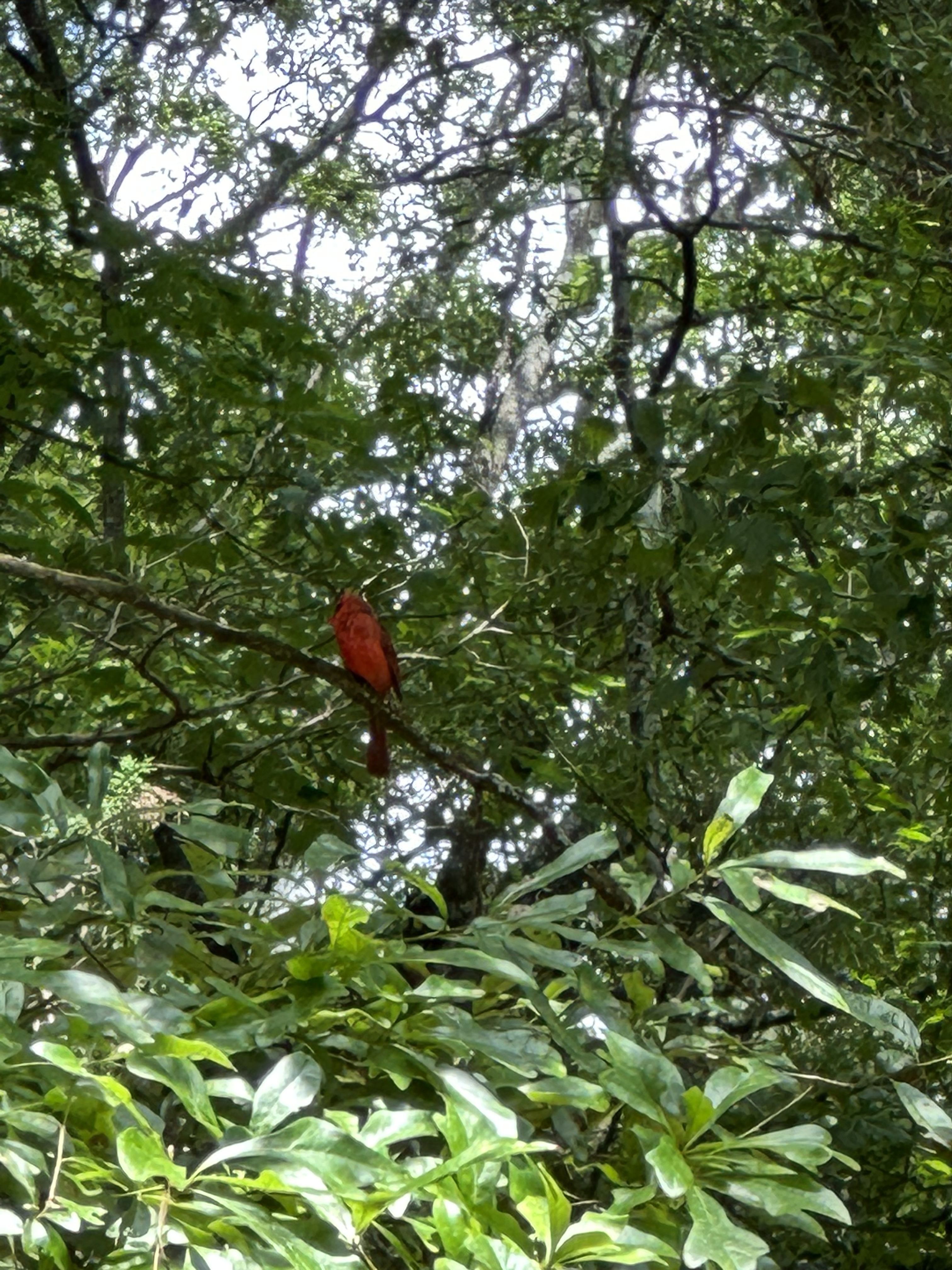 Hawk in a tree (just left of center) – funniest thing: I said a quick prayer, “Lord, I would love to see a hawk today.” I always feel my mother’s presence when I see one. I did what I always do: I pulled into the driveway, turned off the air, put the windows down so I could drive slowly, hearing the gritty crunch of gravel under my tires, and began inching up the driveway. I first saw a tufted titmouse, then a robin. As I approached the top of the hill, I caught a glimpse of a large upward wingspan swooping up off to the left. I grabbed my camera, and for one moment the hawk took it all in and the next swooped off back into the deeper woods. I caught one photo, here, and one of just his tail as he flew away. What a beautiful moment – a prayer for a hawk sighting, a hawk, and the feeling of the presence of my mother. No prayer is ever too big – or ever too small!