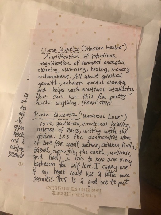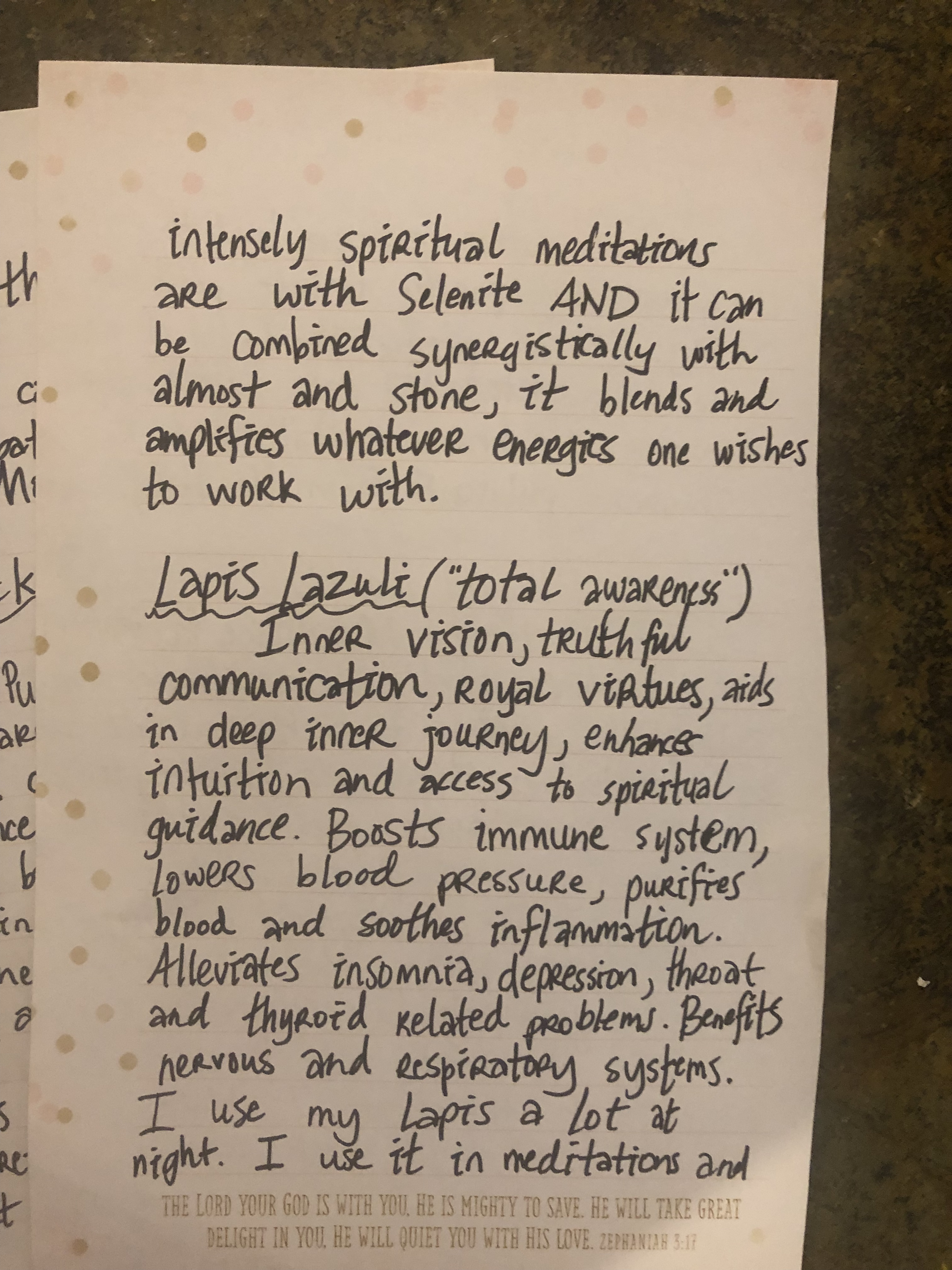 And what treasured gifts these are! Perhaps the most touching of all are the handwritten pages explaining every stone, telling of its qualities and a few personal notes scattered throughout – the most cherished one on the Lapis Lazuli note, explaining how my daughter feels close to my late mother as she still wears her bracelet filled with these brilliant blue stones. My mother, as it turns out, had jewelry made of a variety of stones and also suffered from anxiety. We continue to learn more about my mother and to “connect the dots” long after she has passed. It’s not surprising to learn that she, too, knew the benefits of stones. I often wear her jade necklace and some of her other stones that she wore frequently.