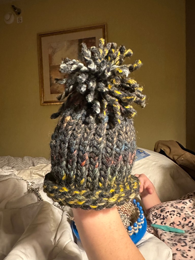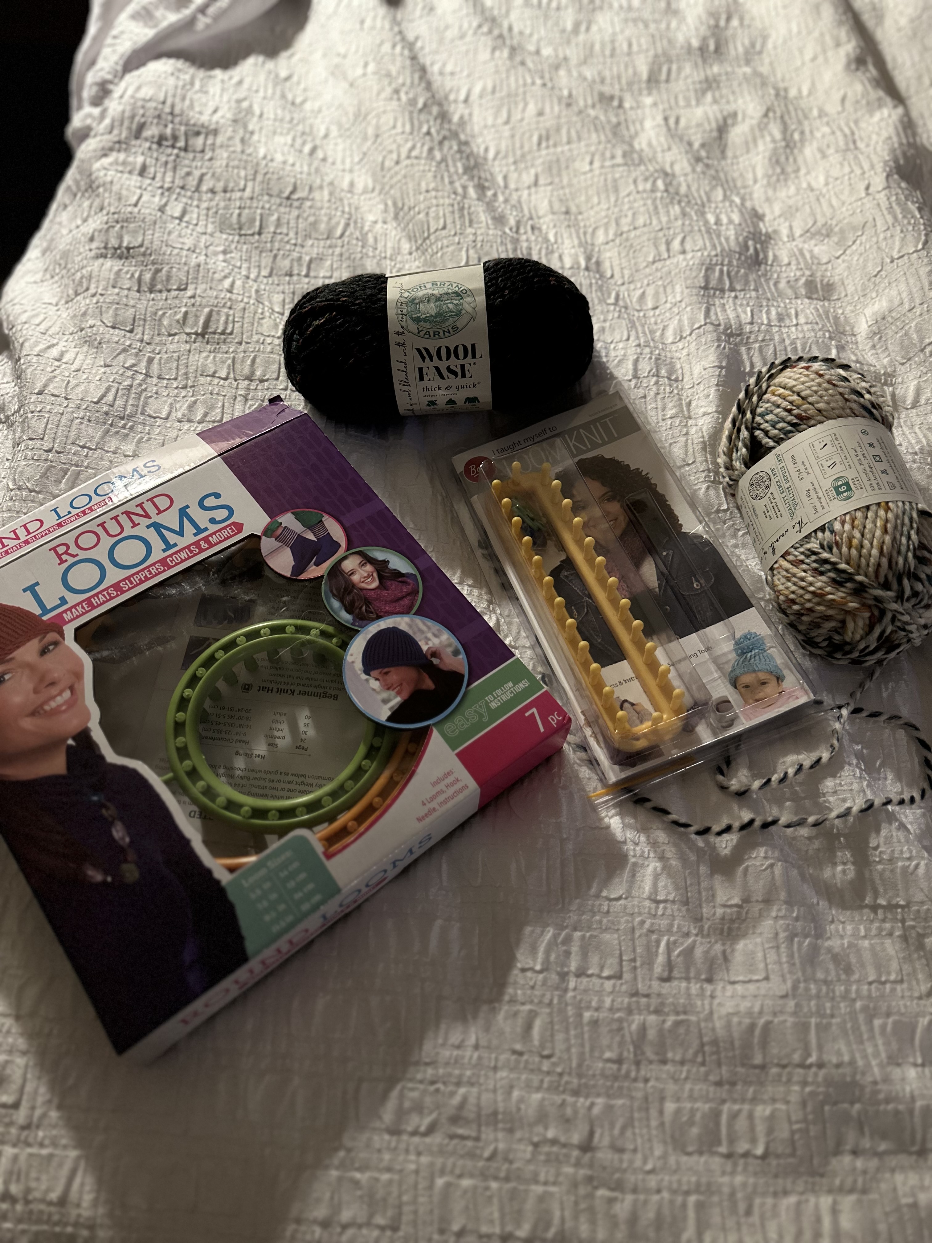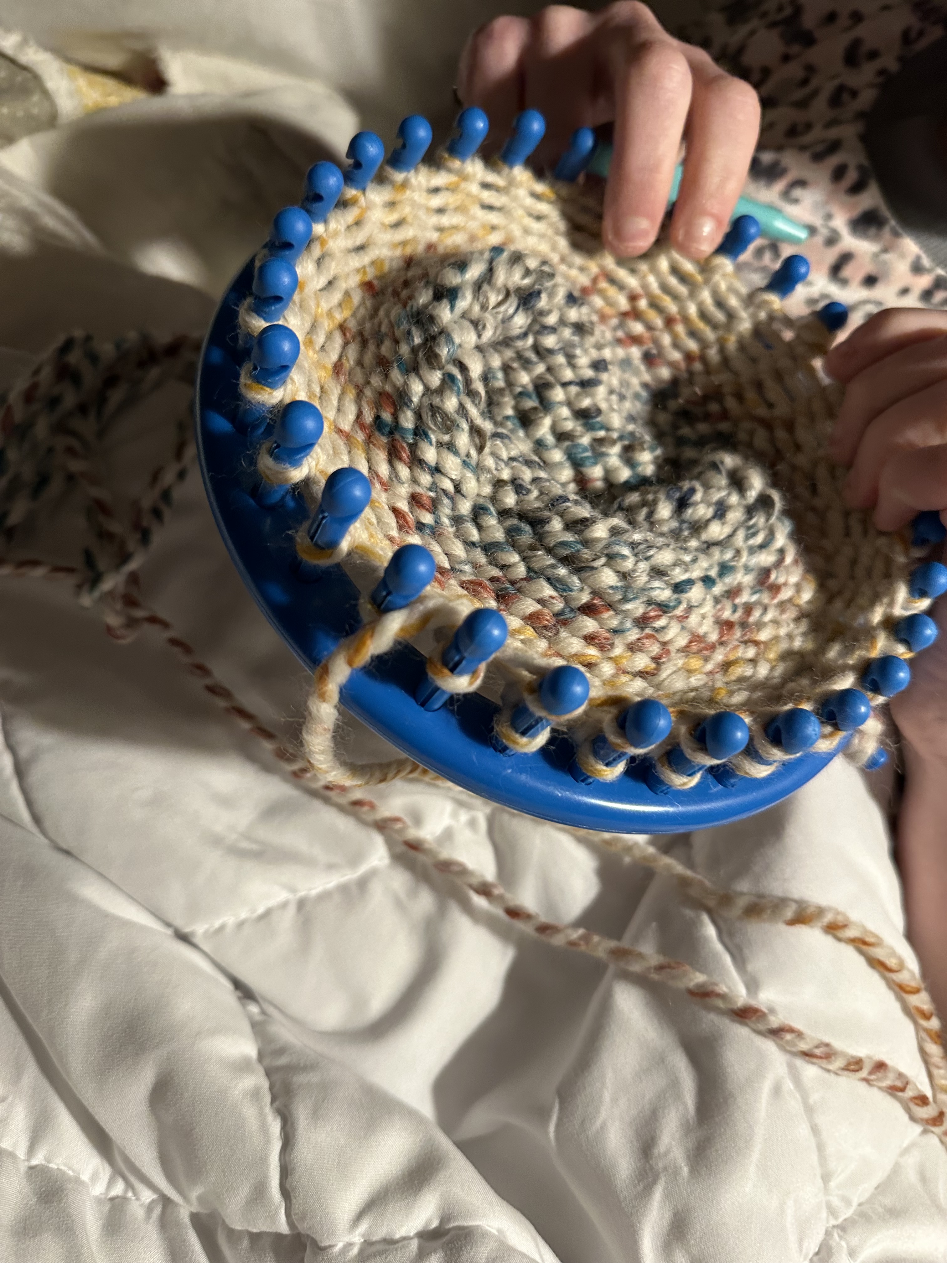 Years ago, we made a bunch of hats using round looms. I’d passed the looms on to someone else to enjoy once we’d squeezed all our own joy from them, so I stopped in and got some new ones, along with some yarn for the journey. Together, we watched a refresher YouTube video to re-learn how to cast on and cast off, and we started our handiwork.