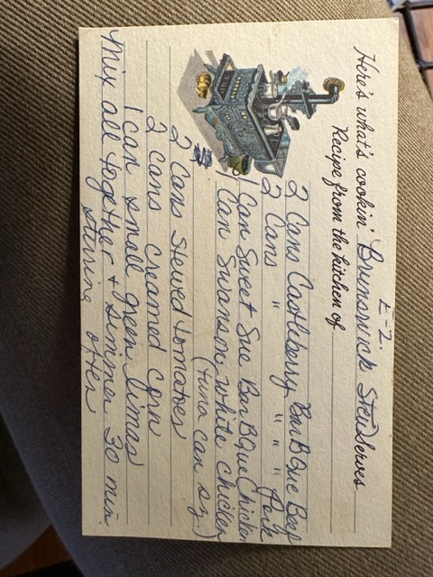 I glance over at my dogs, deep in a morning snooze, and glimpse my mother’s rippled swiss dot milk glass on the kitchen counter. I think of her recipe for E-Z Brunswick Stew, and I take it from the recipe box to share with you today. Though Mom is no longer here with us, her legacy lives on through her recipes and memories.