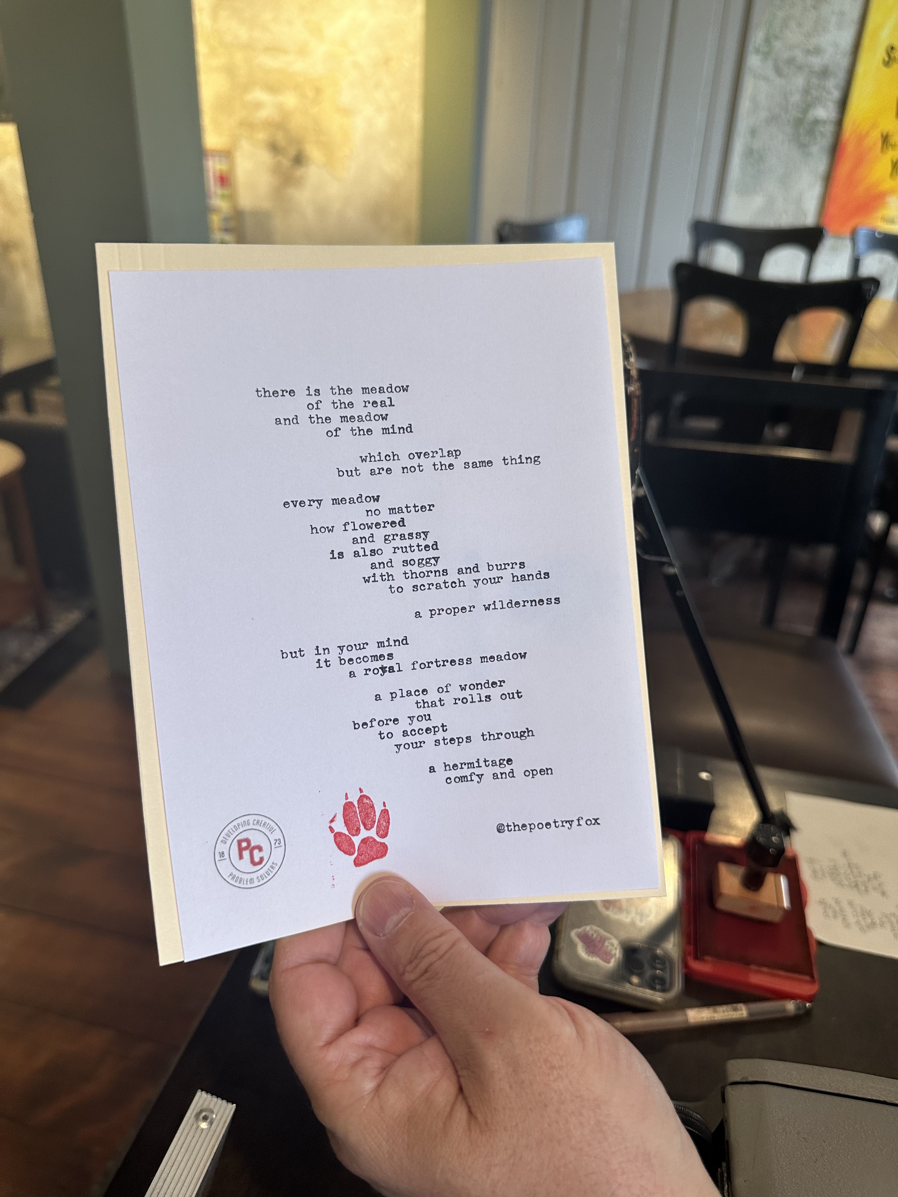 My role as the District Literacy Specialist for Pike County Schools in Georgia involves utilizing grant funds to create Literacy events to ignite reading and writing passion in our schools and throughout our community. When my soul sister Fran Haley of North Carolina posted about The Poetry Fox visiting her school years ago, I tucked that thought away as a dream to bring him from her school event in Zebulon, North Carolina to our coffee shop in Zebulon, Georgia to work his magic, sitting at his table in a fox suit, pounding out poems on his vintage typewriter for folks who stand in line to offer him their word.