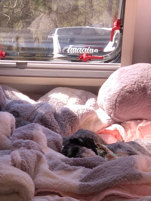 For now, I’m settled into my writing chair, enjoying the early morning silence of the house. I’ve taken the boys out for their morning relief romp, and they all came back in and settled back to sleep right away. I can hear a Carolina Wren singing at the top of its lungs through the kitchen window, and the faintest light looks like pinholes through the tree leaves against the eastern side of the Johnson Funny Farm.