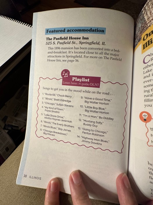 The Route 66 edition that I purchased came with a scratch-off code in the front cover of the book, activating a free month of the Roadtrippers Plus app. The organization of the book gives a simplified view of a long road trip, organized into six legs of the overall trip. One thing I particularly love is the playlists for each leg, featuring songs of those national regions. I have discovered, too, that there is a Pandora station entitled Route 66, which will make it fun to enjoy ahead of time and along the route.