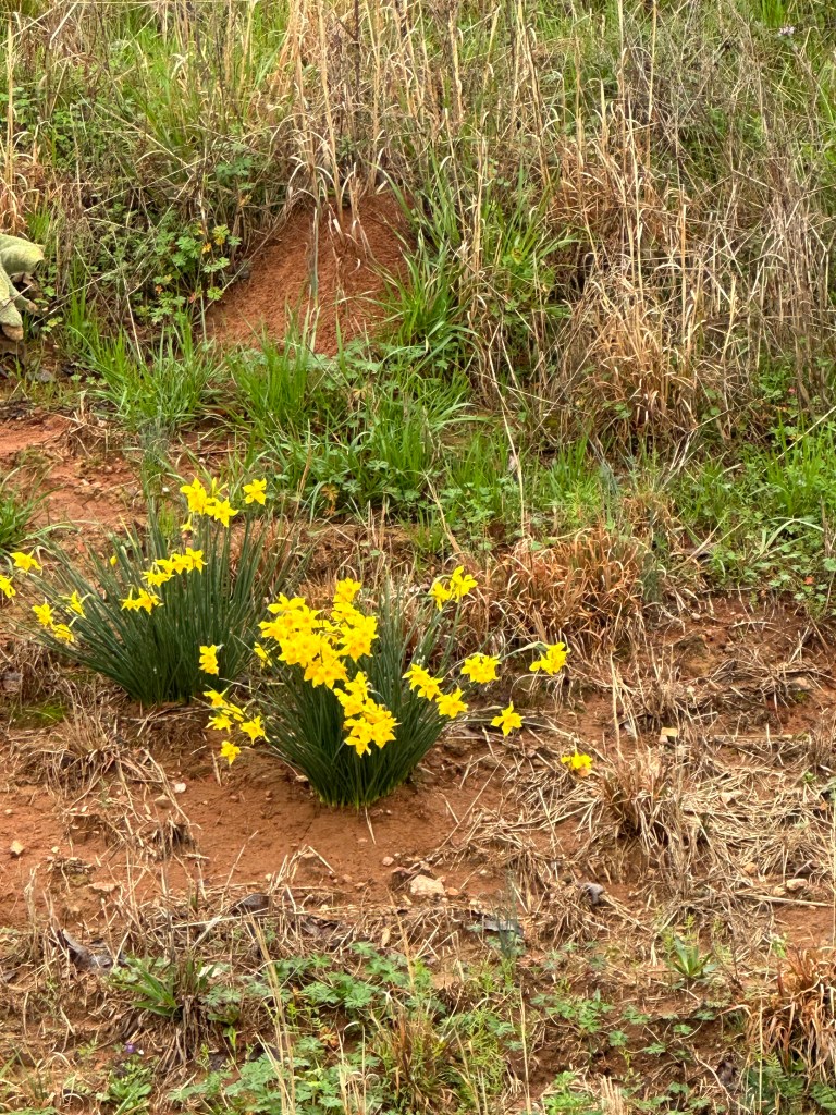 Today’s poem is a triolet, inspired by Barb Edler’s post yesterday. Before Barb’s mother died, she planted daffodils, and these are Barb’s favorite flowers. I, too, lost my mother (December 2015) and miss her very much – my mother’ s favorites were wild petunias and yellow roses. When I need to count blessings and decompress, I take my keys off the hook by the door and start up my little blue Caribbean RAV4 and go riding the country roads. I look for the blooms, the rolling hills, the hawks on wires, the cows in the meadows. It puts the world back in perspective for me – – I am here but for a blink of an eye, and whatever is worrying me, too, shall pass.